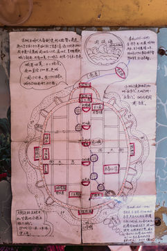 Il ne reste plus trace non plus de la tête qui a été détruite durant la Révolution Culturelle, mais celle-ci était située près d'un petit lac au sud, alimenté par une rivière souterraine. Appelé "Mer"ou "Piscine Taïji", ce lac est de première importance car selon le Feng Shui, la tortue ne peut vivre loin de l'eau. Suivant le cours de la rivière souterraine qui traverse Yongtaï, cinq puits ont été creusés et représentent les cinq organes vitaux - le coeur, les poumons, le foie, le pancréas et les reins. Et comme une tortue a toujours une queue, 5 monticules à l'extérieur des remparts la symbolisent.