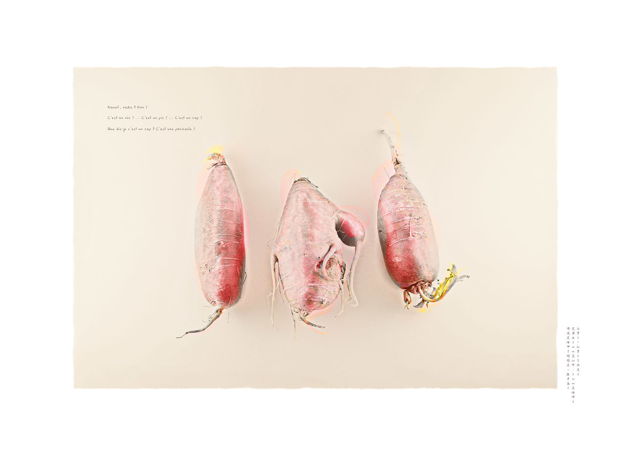 Ce sera donc la cuisine qui sera mon prétexte à l'expression de cet écart culturel, ou plus exactement les ingrédients bruts que je croise sur les étals des marchés et qui me sont énigmatiques. Et qui le resteront, faute de pouvoir lire leurs noms, questionner le chaland ou même ouvrir le dictionnaire.