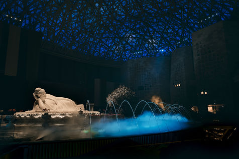 Après avoir enfilé des housses de protection autour de nos chaussures, nous pouvons entrer dans le palais. Même si on se doute bien de l'extérieur que la taille de la salle sera grande, on est malgré tout saisi par l'immensité du lieu ! Haute de l'équivalent de 3 étages, la salle abrite un bouddha en marbre de 10 mètres de long allongé. Située au milieu d'une fontaine d'où sont projetées des vapeurs d'eau, la statue tourne sur elle-même et un jeu d'éclairages changeants digne d'un son et lumières illumine l'énorme salle pour imiter le rythme du jour et de la nuit.