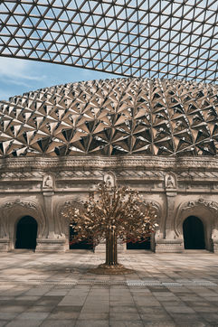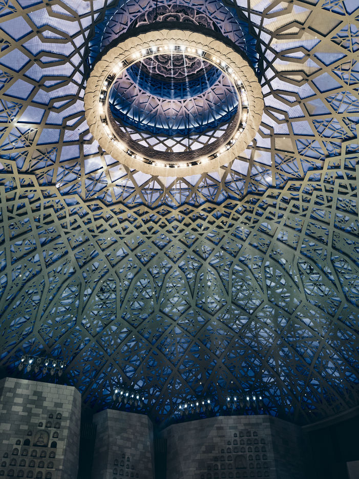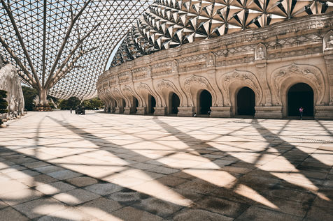 Le premier dôme, extérieur, vient partiellement recouvrir celui du palais à proprement parler. Cette immense structure métallique aérée symbolise la protection et la bénédiction illimitée en imitant la cape de Bouddha qui vient envelopper son corps.