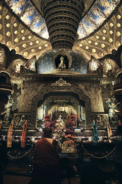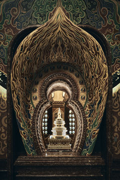 The first dome, outside, partially covers the palace itself. This immense airy metal structure symbolizes protection and unlimited blessing by imitating the cloak of Buddha which envelops his body.