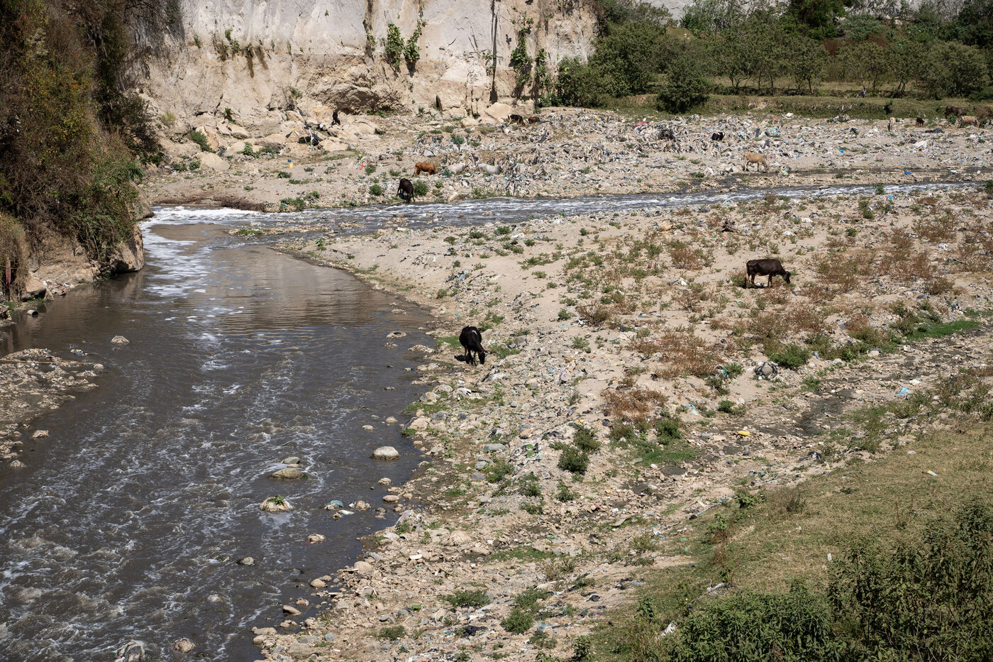 The banks of the Las Vacas river outside Guatemala City are covered in bags, plastic packaging, plates and shoes.