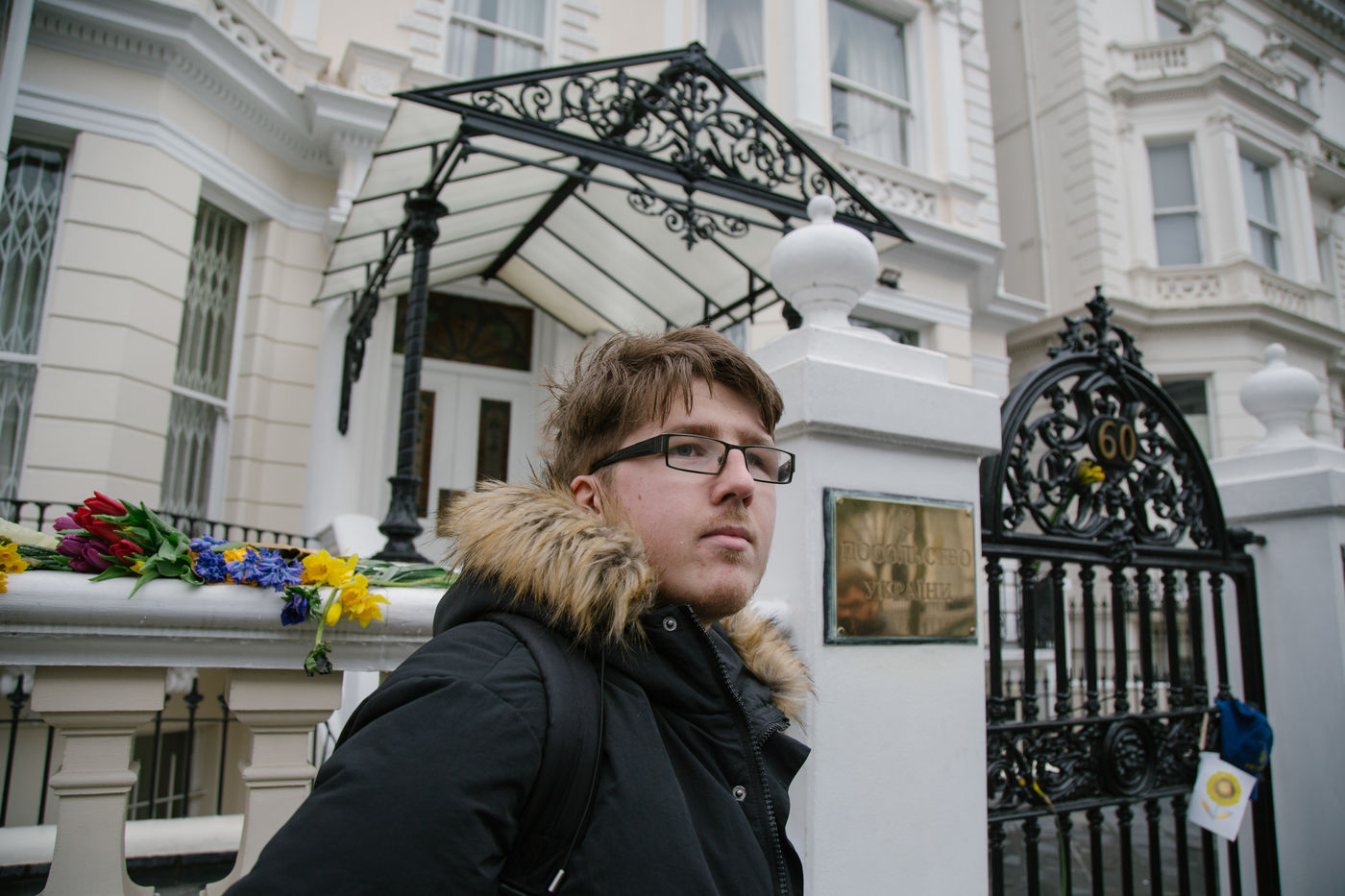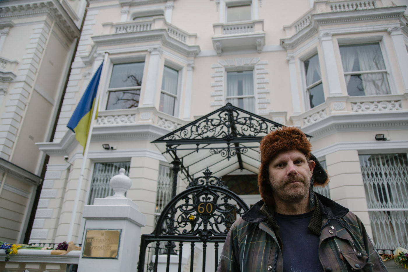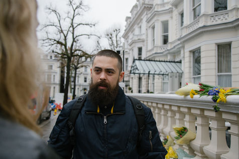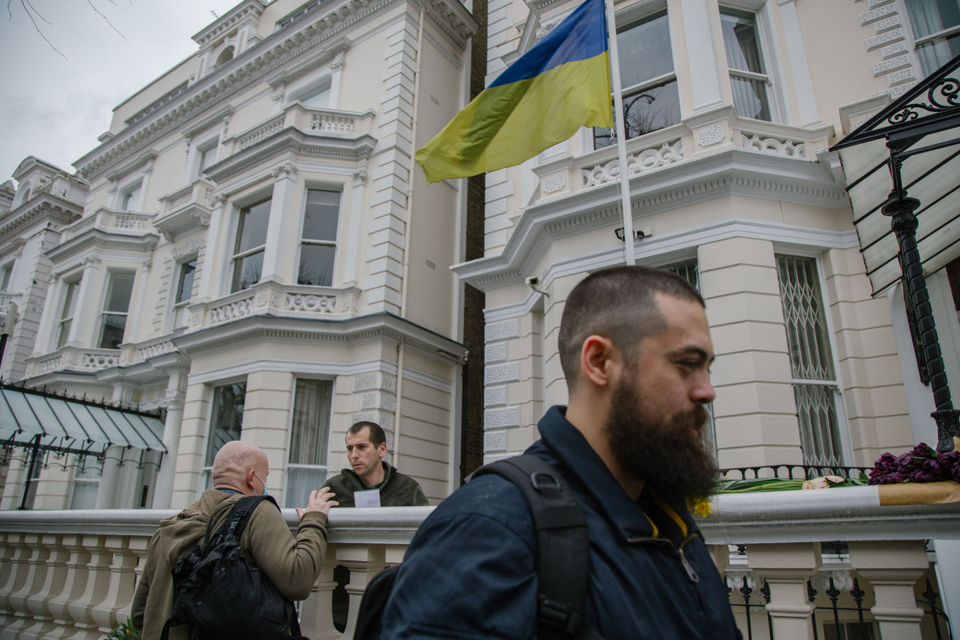 Le 2 mars 2022, une poignée de volontaires sonnent l'interphone de l'ambassade d'Ukraine à Londres pour rejoindre la légion internationale pour la Défense de l'Ukraine, annoncé par le président ukrainien le 1er mars. Des hommes âgés de 20 à 63 ans se présente tour à tour devant le bâtiment officiel pour rejoindre les lignes ukrainiennes.