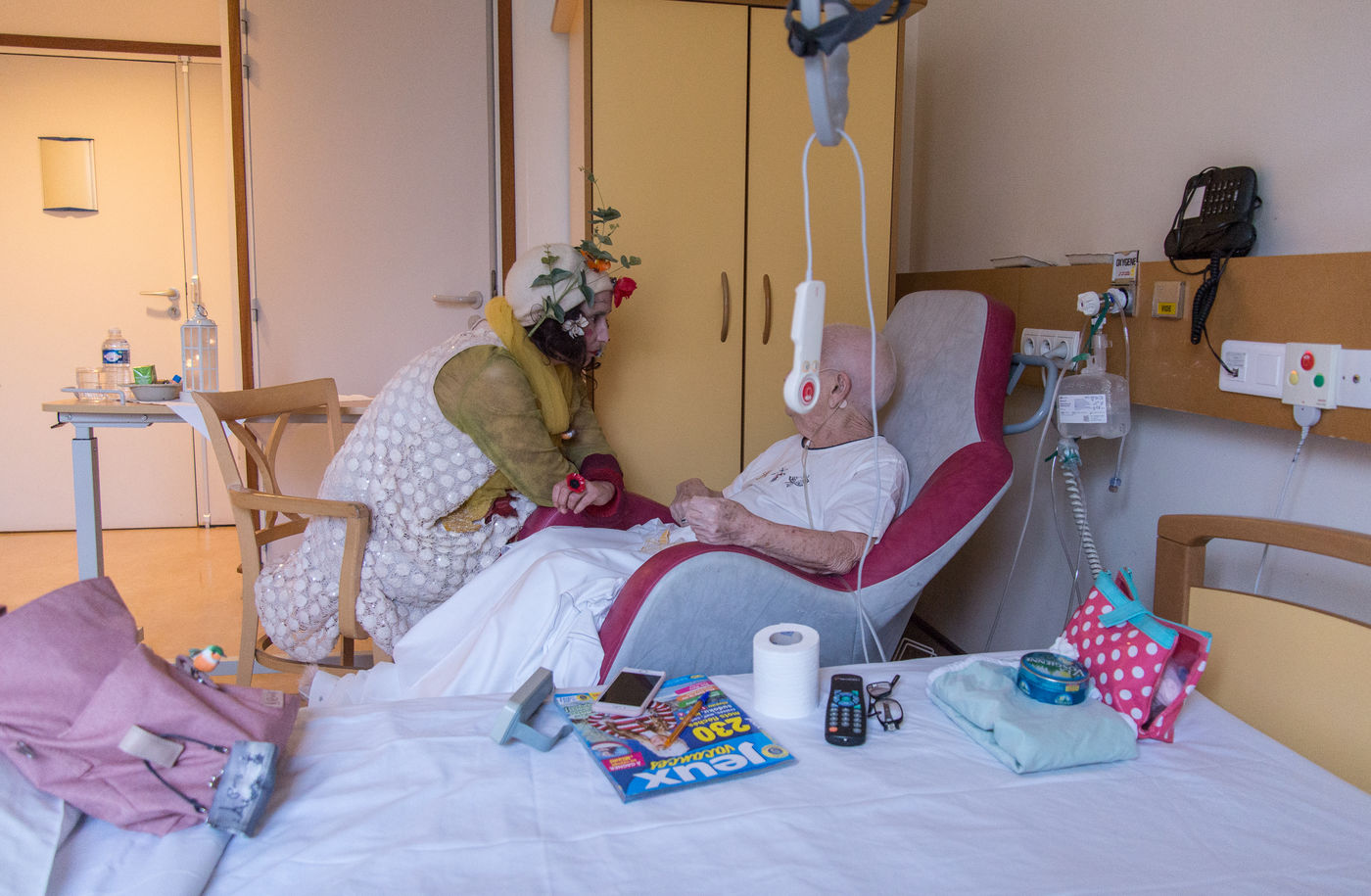 We are projected into the heart of the human being, without warning, far away from the preconceived idea of the "mouroirs", where the human thickness that connects us to each other would totally disintegrate. So far away. Where neophytes would vulgarly think that there is nothing left, not a drop of hope, but beeps resounding in the corridors of medical centres, a few tips and the last bit of a reading, left on the shelf, next to one's personal belongings.