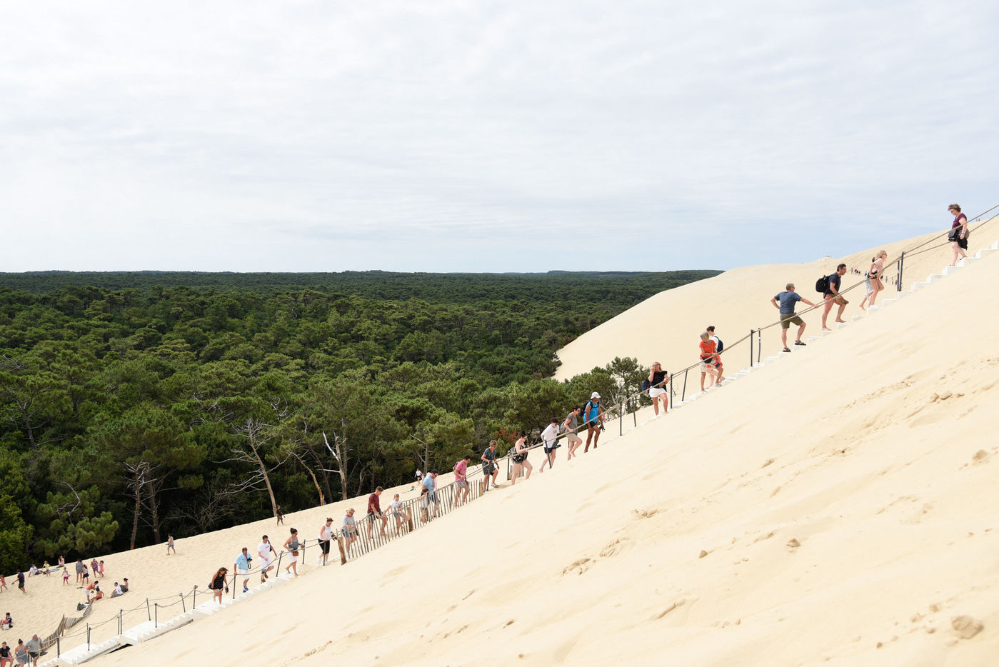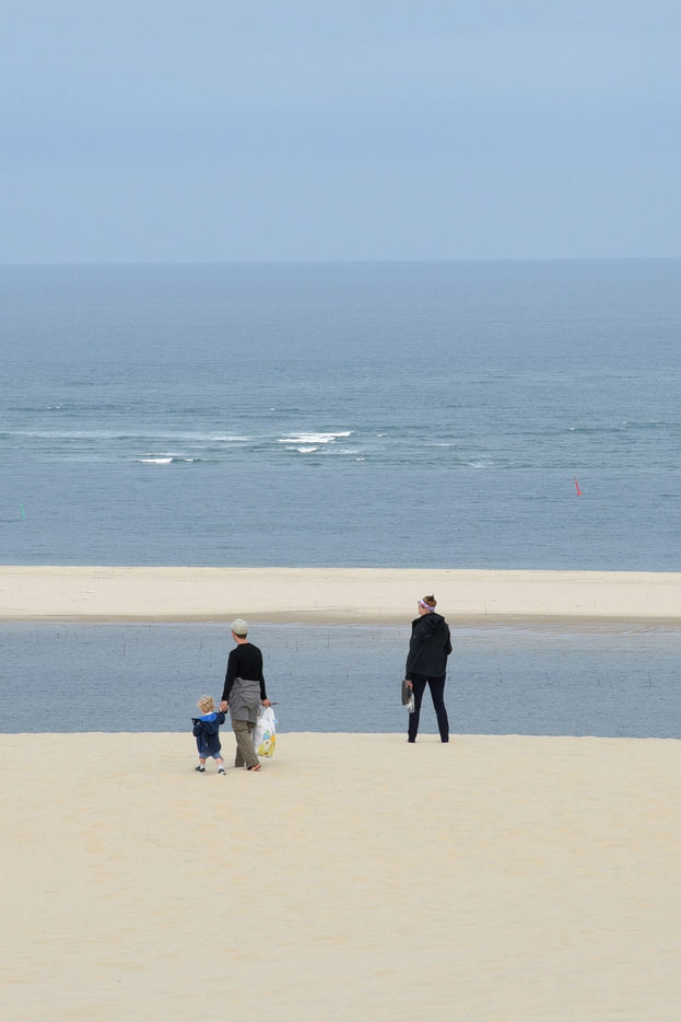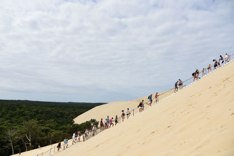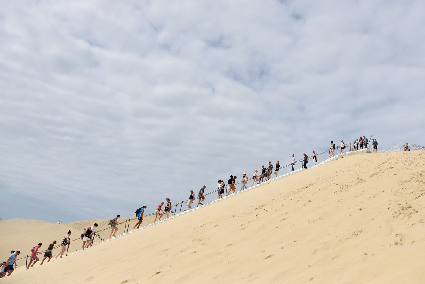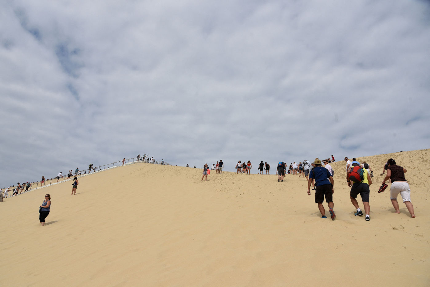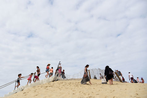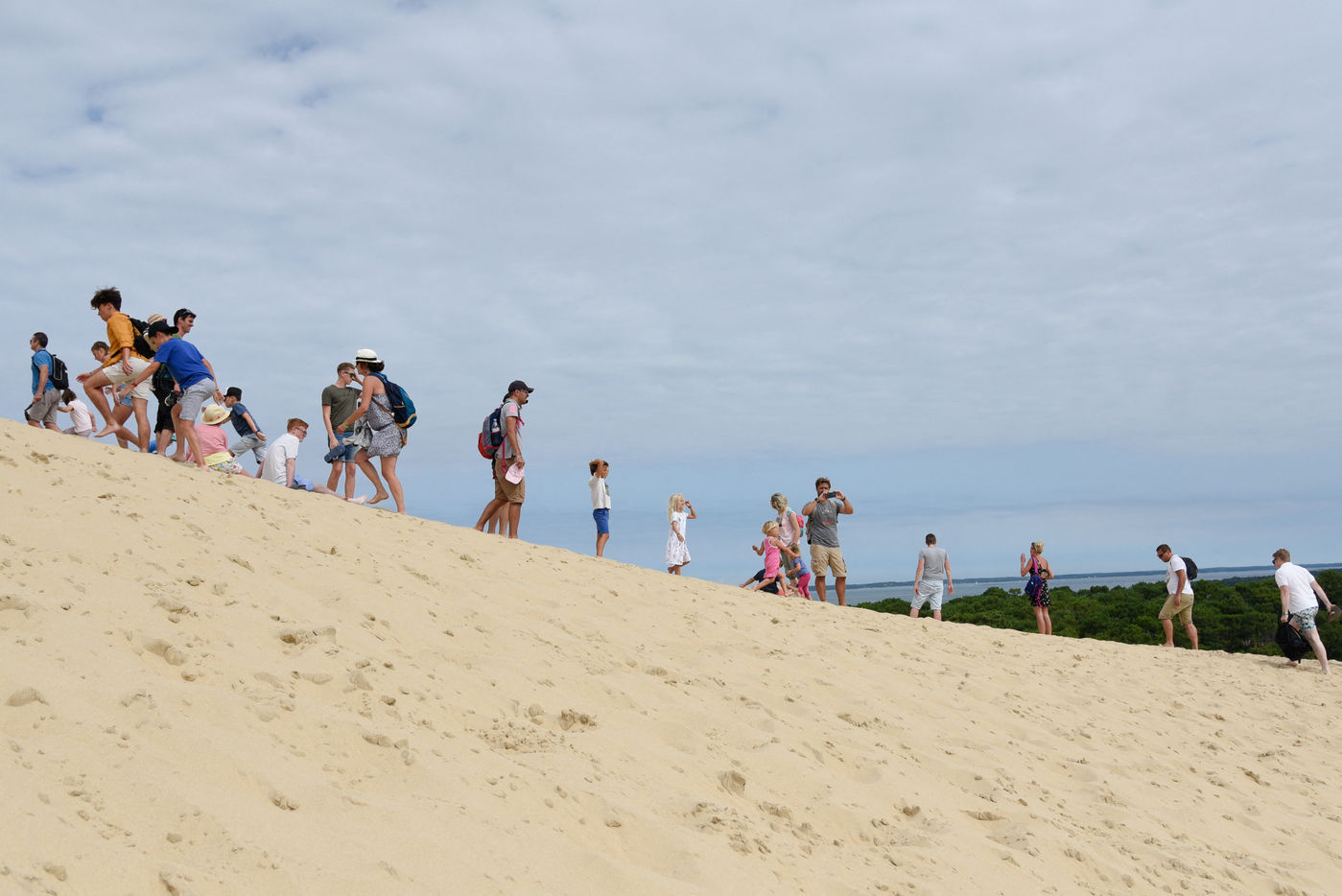 Des premières heures du jour dans la quiétude jusqu'à la fin de matinée avec l'arrivée de centaines de touristes, promeneurs, curieux... Avec près de deux millions de visiteurs par an, le site de la Dune du Pilat sur la commune de la Teste de Buch, reste particulièrement prisé avec ses 106,6 m de haut, 3 km de long, des millions de m3 de sable fin et 4000 ans d?histoire sous l?action des vents et des marées. Un patrimoine naturel unique en Europe.