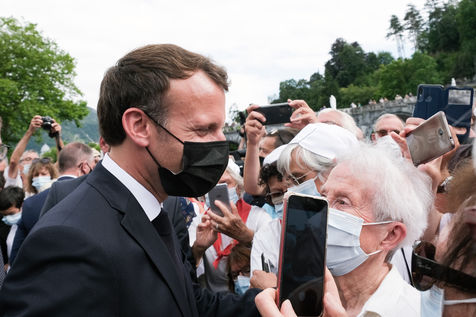 Au coeur du sanctuaire, Emmanuel Macron s'est livre a un bain de foule dense parmi les personnes qui l'attendaient nombreuses dont les hospitaliers et pelerins avec les traditionnels selfies, paroles bienveillantes, remise d'un chapelet... Le president de la republique francaise est venu ce vendredi 16 juillet 2021 au sanctuaire de Lourdes, dans le prolongement d'une journee passee dans les Hautes-Pyrenees entre une etape du Tour de France et la visite d'une usine. Emmanuel Macron a ete accueilli par Mgr Herouard, delegue apostolique du sanctuaire, et Mgr Olivier Ribadeau Dumas, le recteur. Il s'agit de la premiere visite d'un president de la 5eme Republique dans le plus grand Sanctuaire catholique de France.