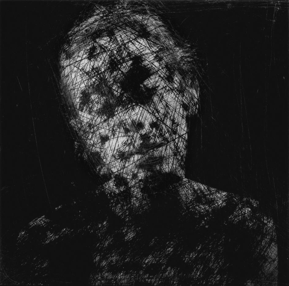 Ainsi, la pièce La mort dans l'âme (2000) repose sur une manipulation non plus optique (Peau de chagrin, Chambre close...), mais physique d'un film issu d'une séance de portrait ancienne. C'est la surface/matière même du support photographique (le négatif) qui est attaquée ici, avec une violence ravie, par la main et le papier de verre. Il a fallu à ce moment là que cette main griffe avec une sorte de hargne la respectable pellicule. Ah, la spontanéité et l'inexplicable du geste ! Le grain de sable. Contre le processus de la machine photographique dont on sait qu'il est asservi, conçu pour produire efficacement des images lisses, ressemblantes. Contre la mollesse qui nous guette, nous gagne. Contre et pour l'image photographique, ce si peu de matière qui sait si bien nous leurrer. Pour une mise au point réglée maintenant au plus près, sur la cicatrice inscrite. A même la peau, à même la photographie, stigmatisée, désignée.