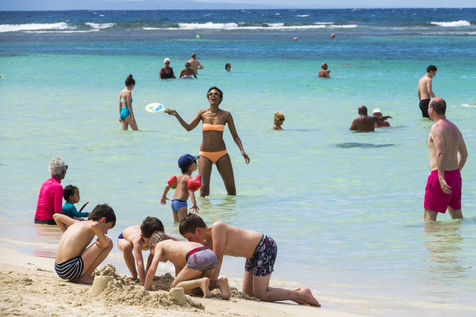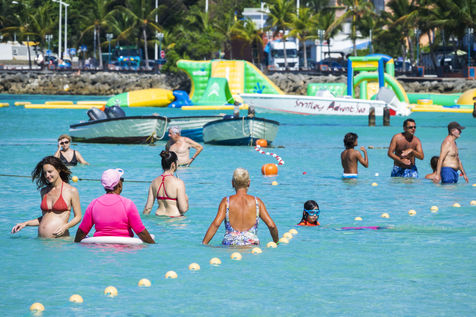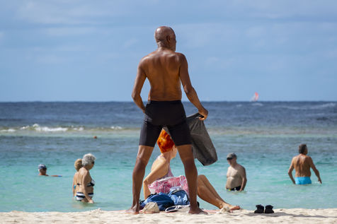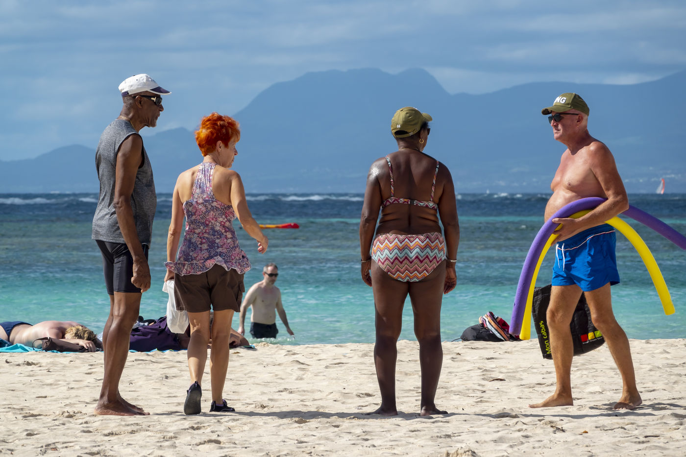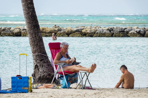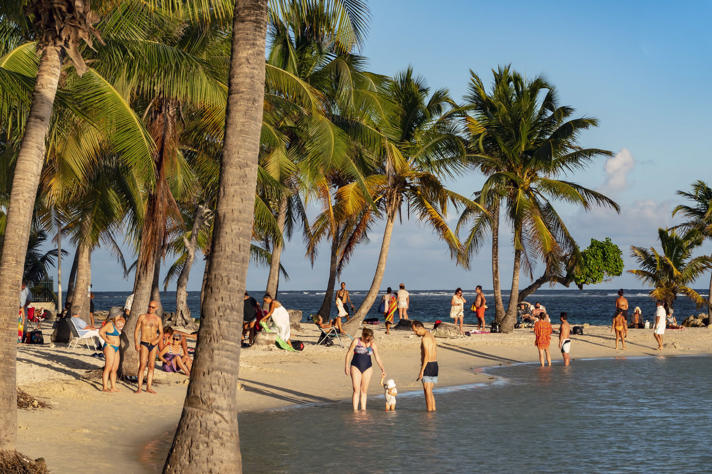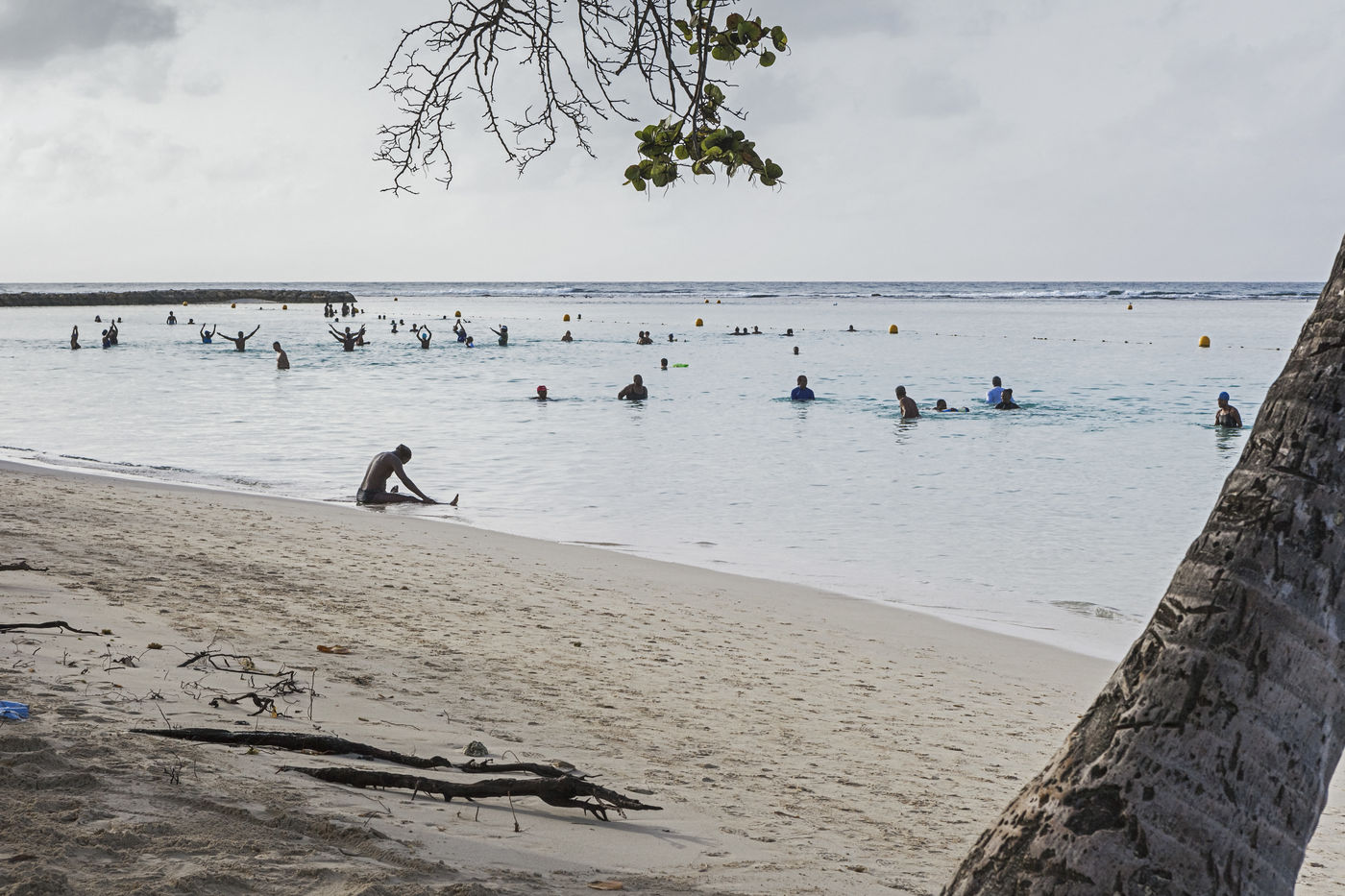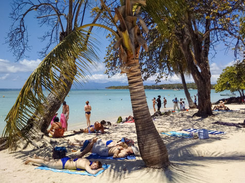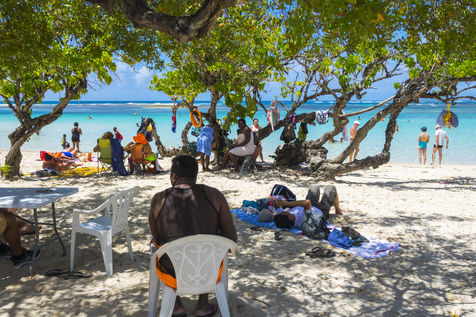 Peu à peu, l'occupation « dynamique » de la plage cède la place aux estivants qui viennent s'aplatir sur leur serviette pour le bain de soleil attendu. Une population familiale, plutôt âgée, des habitués aussi. Crème solaire, lectures, baignade... Seuls quelques nageurs expérimentés crawlent méthodiquement au large. Aux Antilles, la mer est un espace social, on y fait trempette longtemps et toujours en groupe.