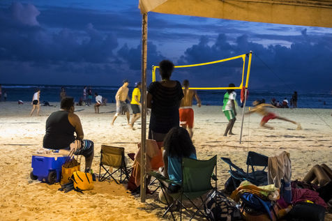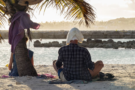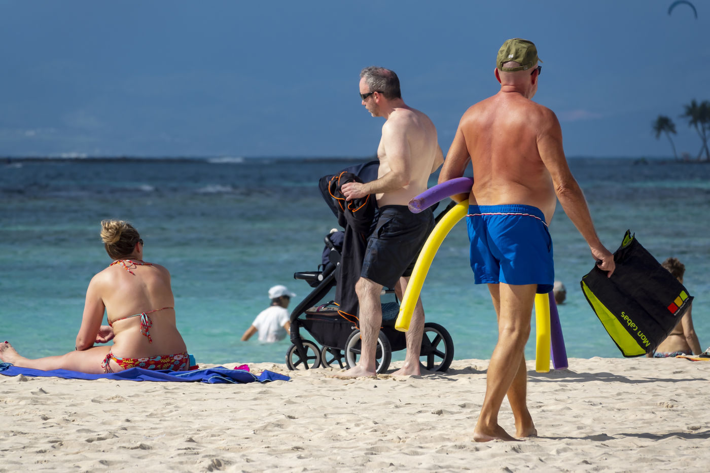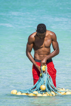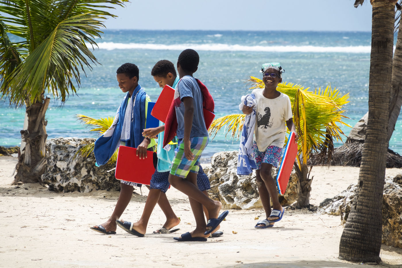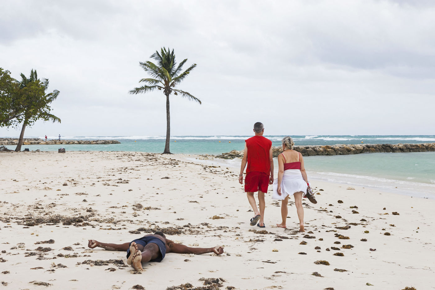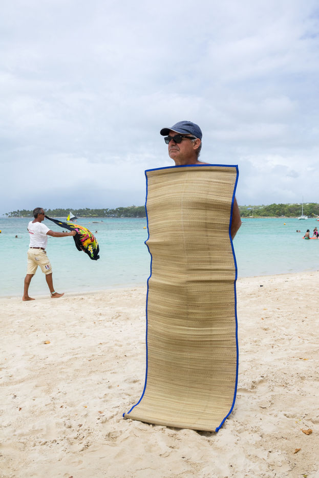 Little by little, the "dynamic" occupation of the beach gives way to the summer people who come to flatten themselves on their towels for the expected sunbathing. A family population, rather old, regulars too. Sunscreen, reading, bathing... Only a few experienced swimmers methodically crawl offshore. In the West Indies, the sea is a social space, we soak for a long time and always in groups.