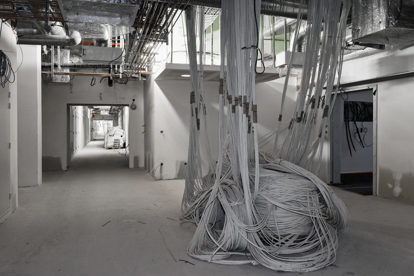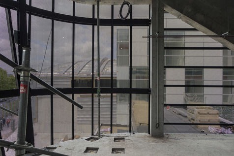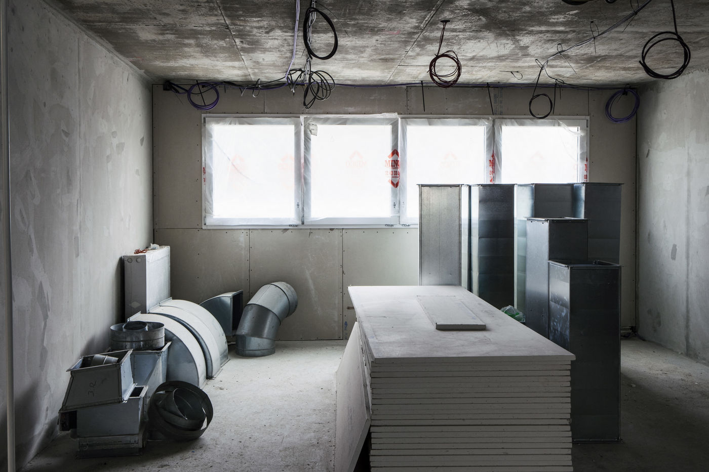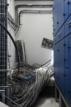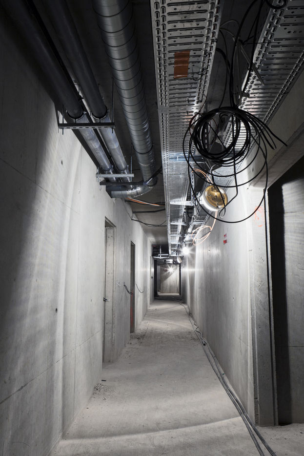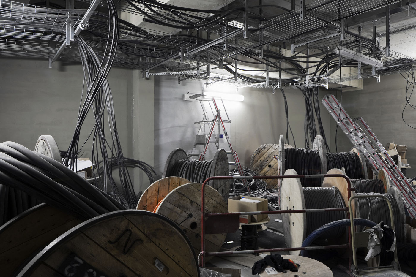It is within the framework of a long-term photographic campaign for the SNEF Group, an international company based in Marseille and specialized in electrical and climatic engineering, that I survey these buildings under construction that we call building sites. But not at any time. At this moment when, exposed, flayed, the space is waiting for a completion. Guts in the air. It is necessary to nourish it, to irrigate it, to feed it for its intended use before the veneer and the interior decoration conceal the organic nature of this work.