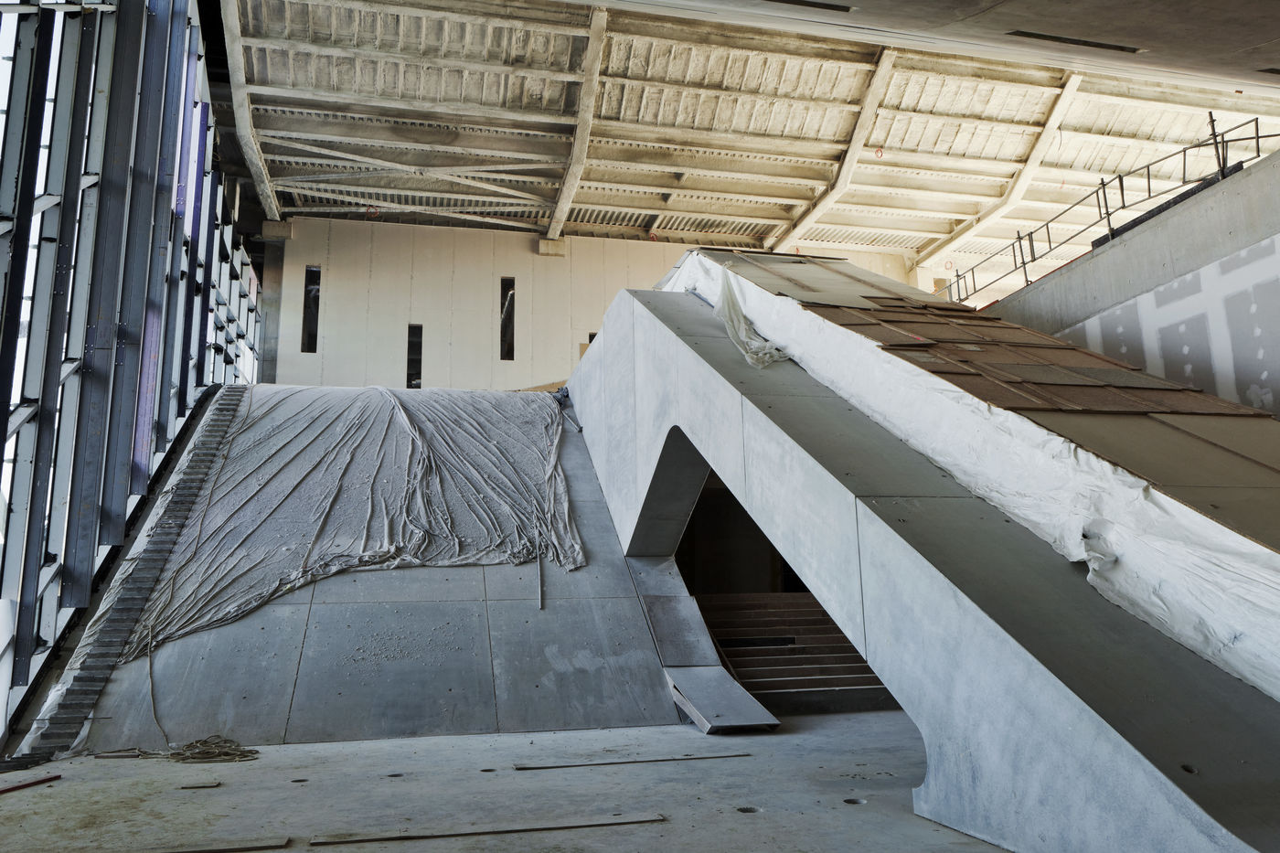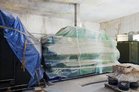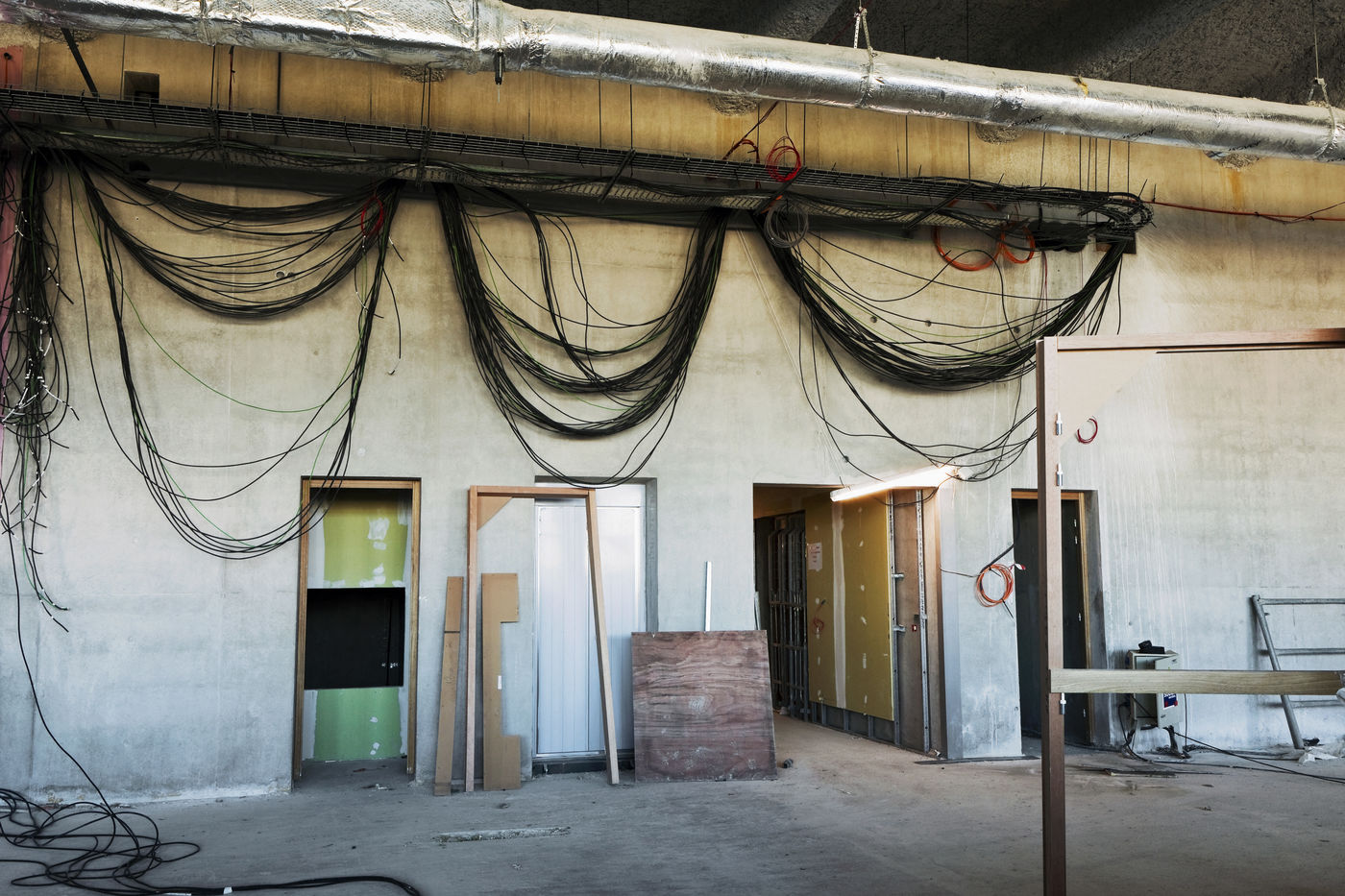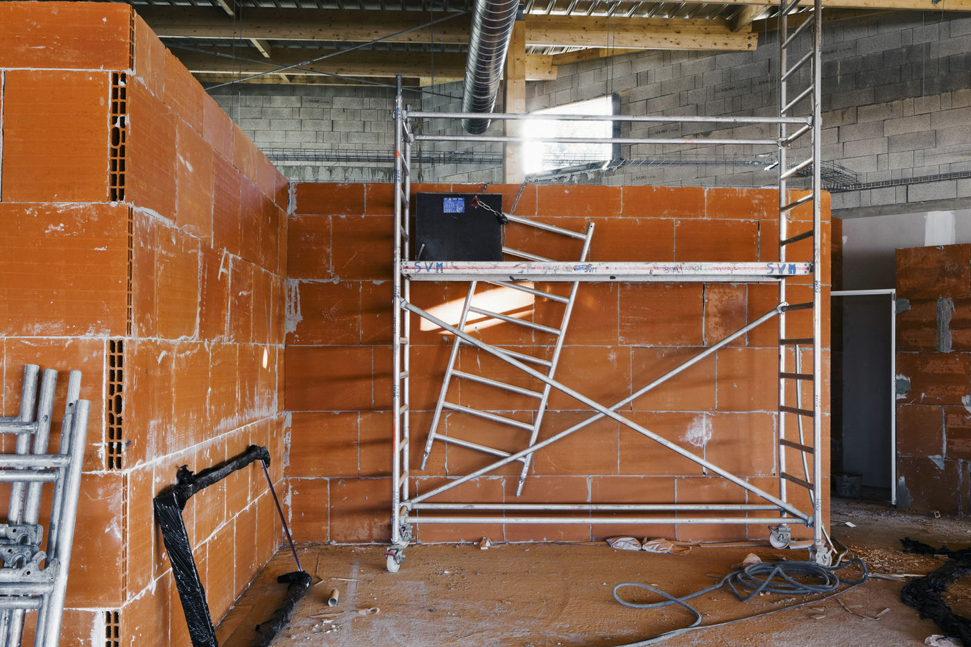 It is within the framework of a long-term photographic campaign for the SNEF Group, an international company based in Marseille and specialized in electrical and climatic engineering, that I survey these buildings under construction that we call building sites. But not at any time. At this moment when, exposed, flayed, the space is waiting for a completion. Guts in the air. It is necessary to nourish it, to irrigate it, to feed it for its intended use before the veneer and the interior decoration conceal the organic nature of this work.