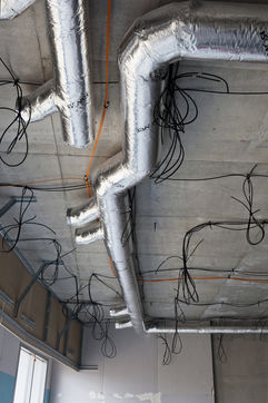 C'est dans le cadre d'une campagne photographique de longue haleine pour le Groupe SNEF, entreprise internationale basée à Marseille et spécialisée entre autres dans le génie électrique et climatique, que j'arpente ces édifices en construction que l'on nomme chantiers. Mais pas n'importe quand. A ce moment où, mis à nu, écorché, l'espace est en attente d'un achèvement. Tripes à l'air. Il faut bien l'innerver, l'irriguer, l'alimenter pour son usage prévu avant que le placage et la décoration intérieure ne dissimulent la nature organique de ce travail.