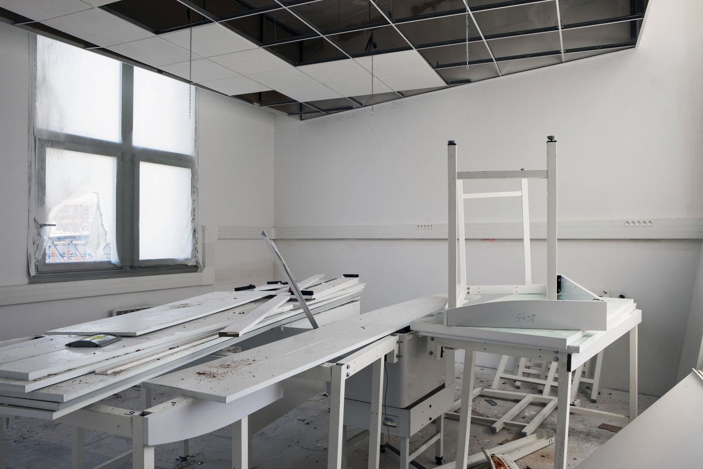 Ces lieux de paradoxe tout entier façonnés de la main instrumentalisée de l'homme ne comportent bizarrement aucune présence visible, en dehors des traces d'une occupation passée pour les bâtiments en attente d'une rénovation, de l'outillage et des objets très provisoirement stockés ou laissés par les différents corps de métiers ou du dépôt de poussière qui sont autant de témoignages d'une activité en cours. Hôpitaux, plateaux de bureaux, administrations, logements... ils seront nombreux à sy presser demain. Nous sommes en milieu urbain, le tertiaire y a assis depuis longtemps sa suprématie.