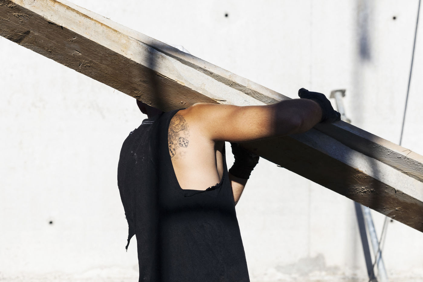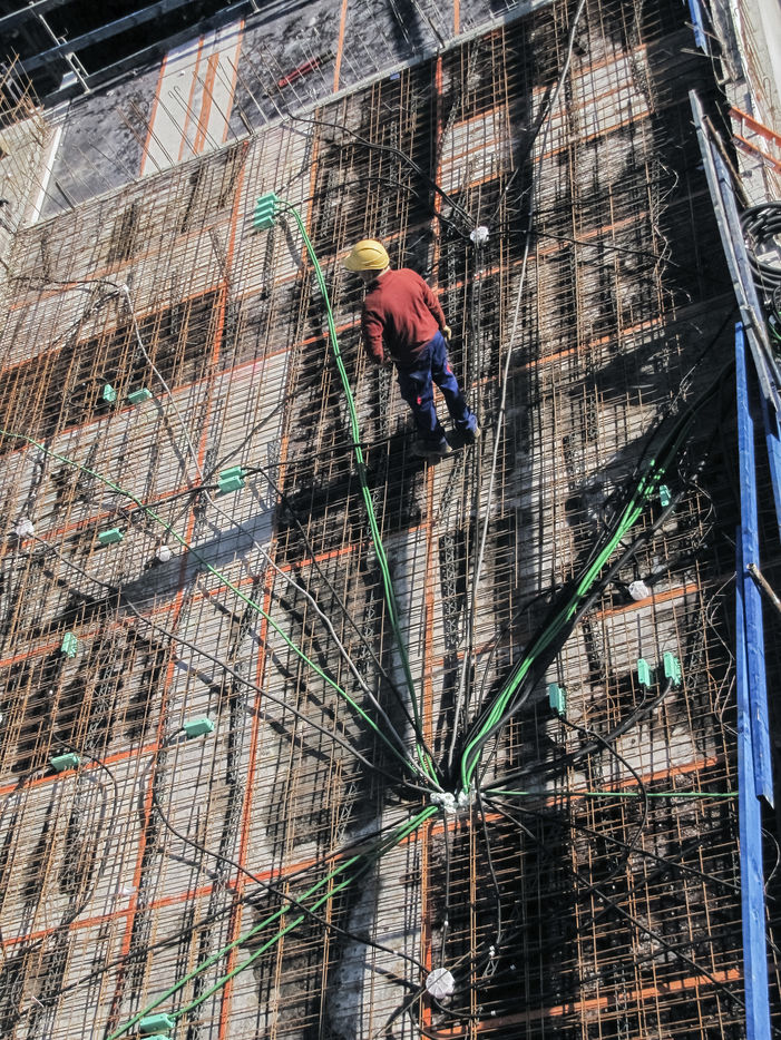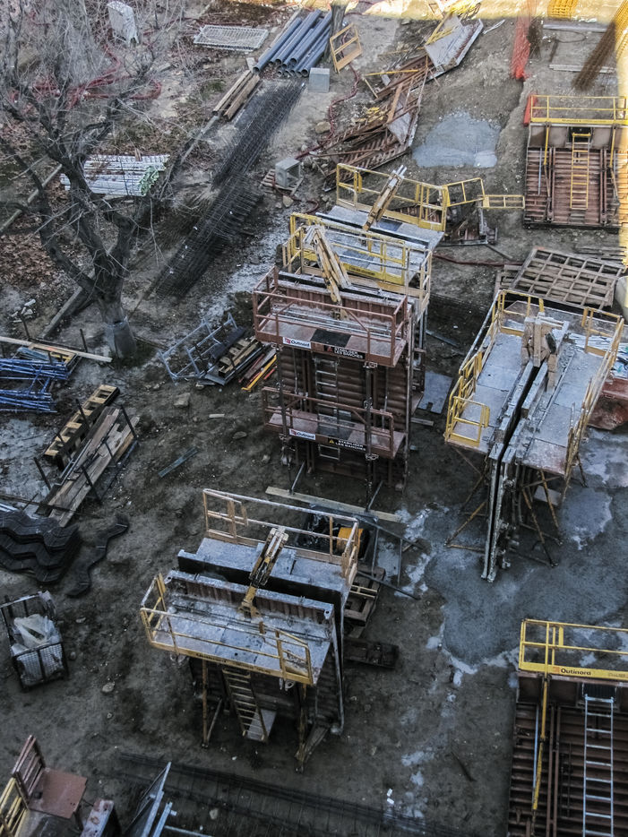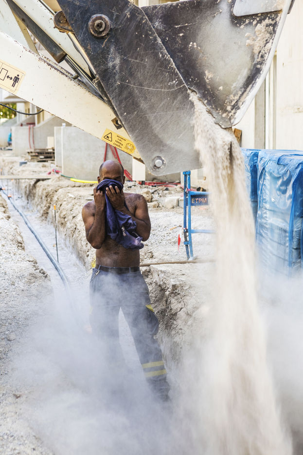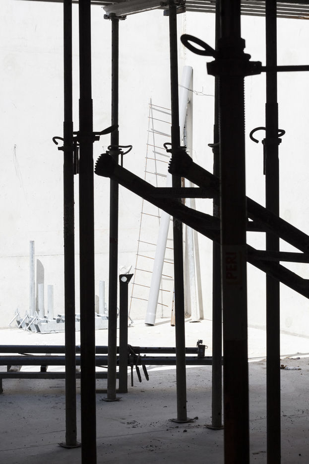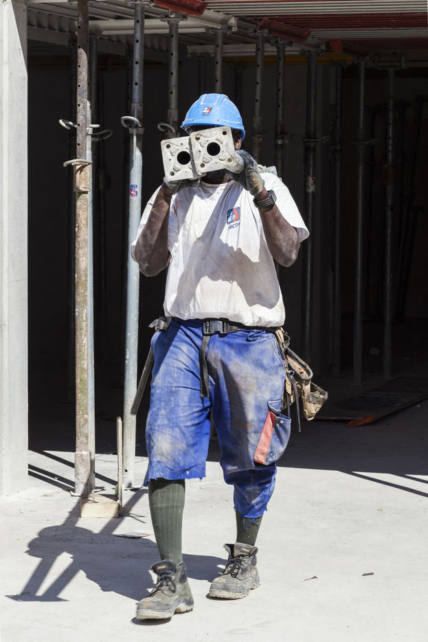 Depuis fin 2013 - les immeubles existants et leur démolition - jusqu'au début 2016, date de la réception de la résidence, je suis allé faire des images de cette étrange chorégraphie. Les premiers temps, pendant le gros oeuvre, le chantier à ciel ouvert déploie une cartographie lisible, mais la fourmilière se complique ensuite lorsque tous les corps d'état travaillent de façon disséminée dans l'édifice. Lorsque l'espace s'y prête, les performances optiques de nos appareils nous autorisent des prises de vue à distance, à la manière des entomologistes qui observent des insectes dans leurs interactions avec l'homme et qui les épinglent parfois en d'étranges collections de spécimens. Sans contester cette posture qui fut aussi la mienne par moments durant ces deux années passées ensemble, j'ai choisi une autre distance, celle que je nommerais celle de la poignée de mains ! Quitte à trébucher sur les ferraillages, mordre la poussière ou glisser dans les flaques de boue... Être au plus près ! Respect !