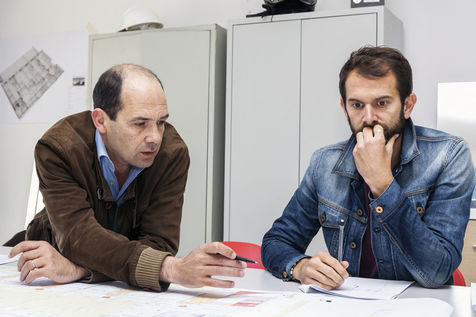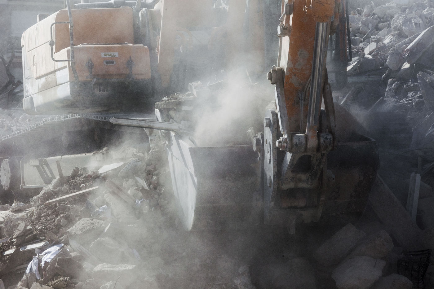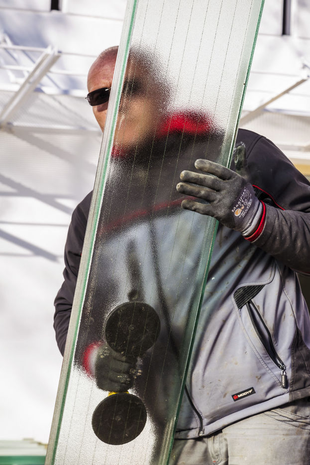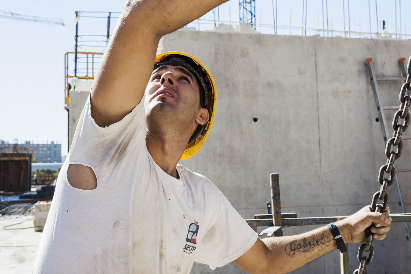 Depuis fin 2013 - les immeubles existants et leur démolition - jusqu'au début 2016, date de la réception de la résidence, je suis allé faire des images de cette étrange chorégraphie. Les premiers temps, pendant le gros oeuvre, le chantier à ciel ouvert déploie une cartographie lisible, mais la fourmilière se complique ensuite lorsque tous les corps d'état travaillent de façon disséminée dans l'édifice. Lorsque l'espace s'y prête, les performances optiques de nos appareils nous autorisent des prises de vue à distance, à la manière des entomologistes qui observent des insectes dans leurs interactions avec l'homme et qui les épinglent parfois en d'étranges collections de spécimens. Sans contester cette posture qui fut aussi la mienne par moments durant ces deux années passées ensemble, j'ai choisi une autre distance, celle que je nommerais celle de la poignée de mains ! Quitte à trébucher sur les ferraillages, mordre la poussière ou glisser dans les flaques de boue... Être au plus près ! Respect !