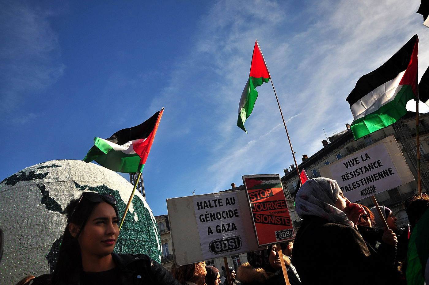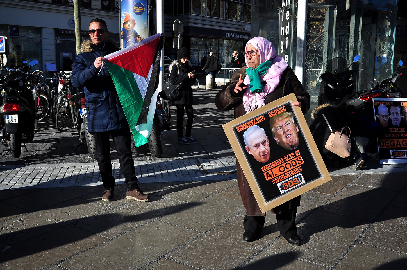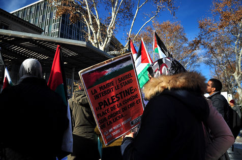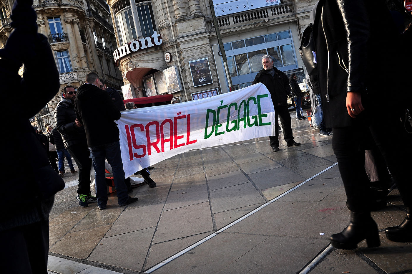 A Montpellier, place de la comédie, des membres de Boycott Desinvestissement Sanctions, une association pro-palestinienne, manifestent contre cette décision avec ce slogan : Touches pas à Al Qods (Jerusalem en arabe). Mais comme à chacune de leur sortie, ils seront sommés par la police d'évacuer les lieux.
