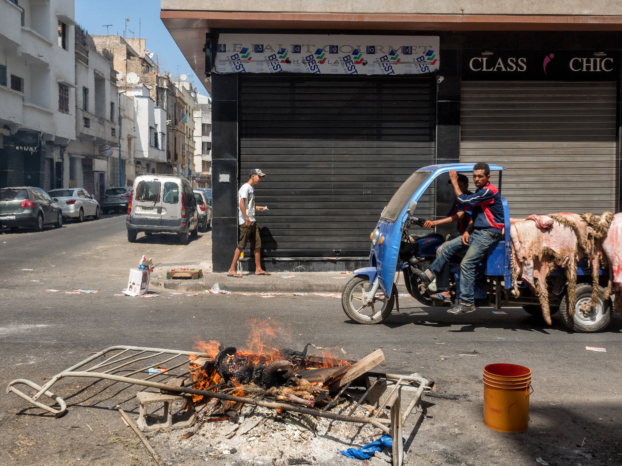 The festival commemorates Ibrahim's (Abraham) sacrifice. Every family sacrifices a sheep, sometimes a cow when the family is affluent enough. During the weeks before the event, sheep and coal vendors can be found everywhere in the city, especially in the old medina which gets even busier than in normal time. During the festival, every housing block gets organized: every street corner gets its own barbecue. Most of the time, teenagers are in charge of the barbecues, which is also an opportunity for them to get some pocket money. Butchers can be seen walking on the streets: some families don't do the sacrifice themselves and would rather resort to their services. Sheep skins are also collected, even if now, in big cities, most of them are simply thrown away with garbage.
