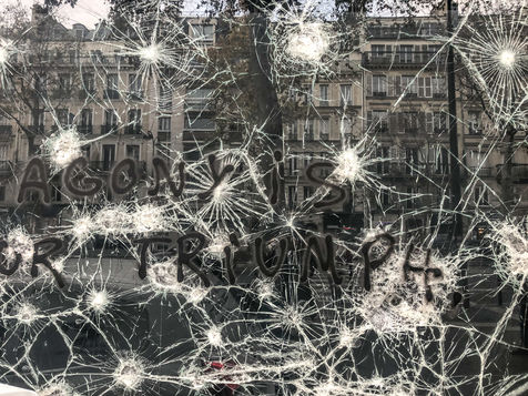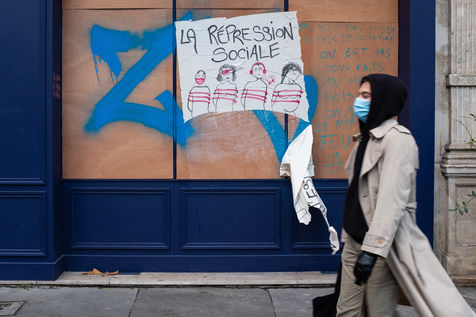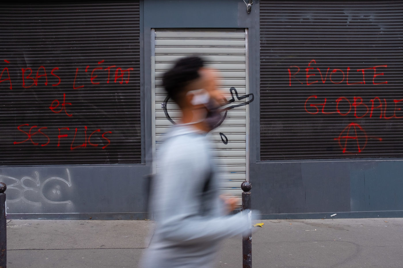 Au lendemain de La marche des Libertes, les tensions se lisent sur les murs de la ville , les traces de la colere défilent le long des trottoirs. Entre la place de la Republique et la place de la Bastille, les manifestant ont défilé pour denoncer les violences policieres et la proposition de loi "securite globale". Paris, 28 et 29 novembre 2020.