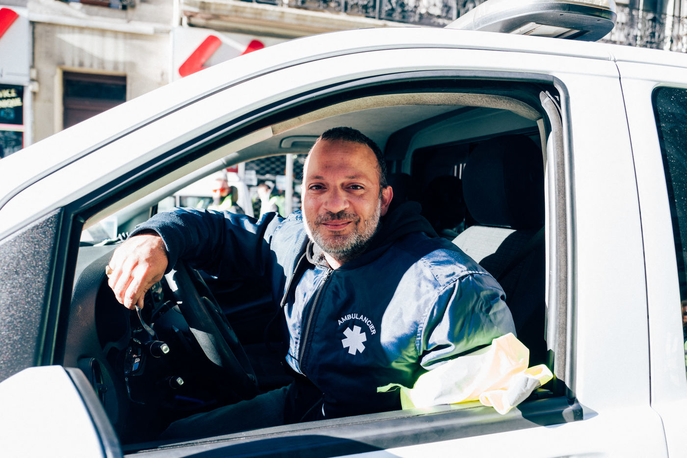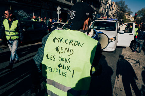 I leave my home around 10am, on the way I cross quite a few yellow vests. In the windows of stores, on the dashboards of cars. The windows are not barricaded, Marseille has not given in to psychosis. I arrive on the Canebière, the ambulances lead the procession and the street-medics join hands to frame everybody. Retired people, couples, young and less young are demonstrating, in addition to the ambulance drivers, the nurses and dockers are also there, peacefully. We can see children and many tricolored flags. The lethal weapon, the yellow vest, is proudly displayed. The atmosphere is good-natured, songs and slogans are flourishing. The procession arrives in front of the prefecture without problems, the few identified potential "casseurs" being quickly evacuated by the staff of the Yellow Vests. We kneel down, hands on the head, history to show clearly the non-violence of the movement. It is also a clear reminder to the interpellations of the high school students of Mantes la Jolie. A delegation is even received in the premises of the prefecture, after negotiations. I hear several clear demands. Repeal of the 1973 law (or "Pompidou-Giscard-Rothschild law"), pure and simple resignation of Emmanuel Macron, VIth Republic, end of some privileges, that the gendarmes remove their helmets (that they did not wear at the arrival of the procession). The crowd is calm but the messages are strong and the calls for calm and non-violence are numerous.
