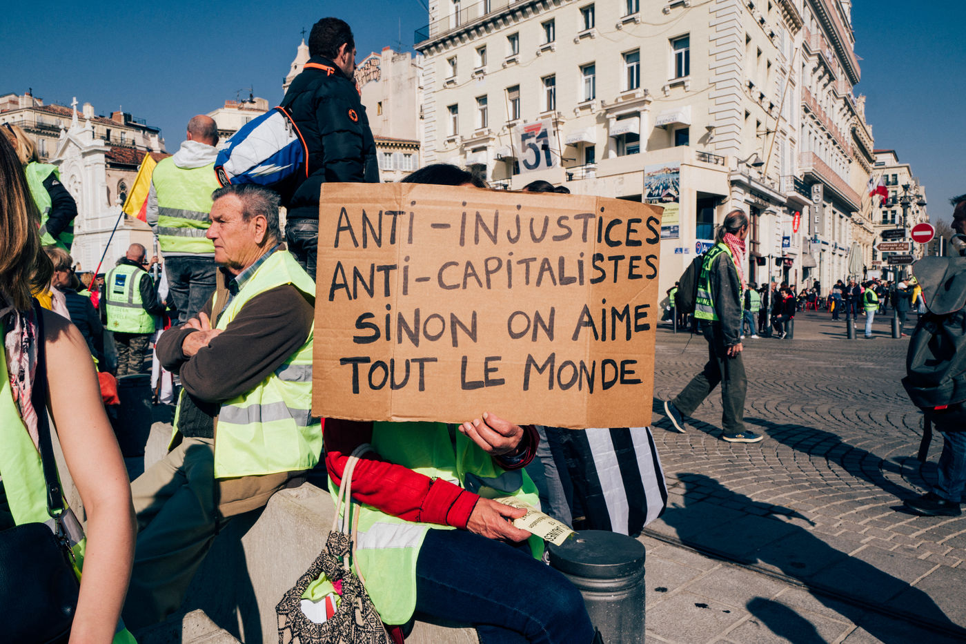 Acte XV des Gilets Jaunes à Marseille. Manifestation se déroulant sans heurts. Mobilisation toujours importante, nombre de retraités encore présents ainsi que de nombreuses mères seules. Beaucoup de visages connus déjà croisés lors des précédents actes.