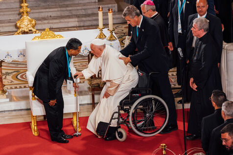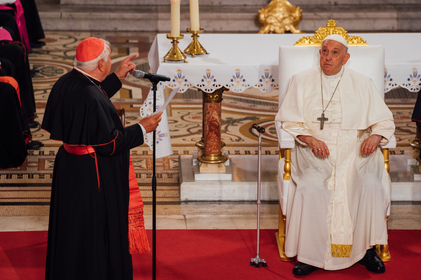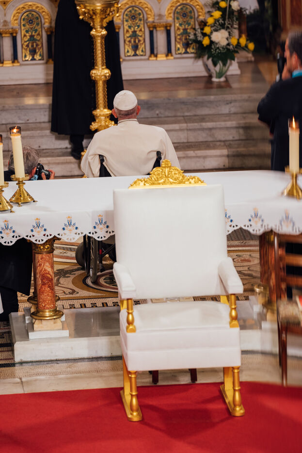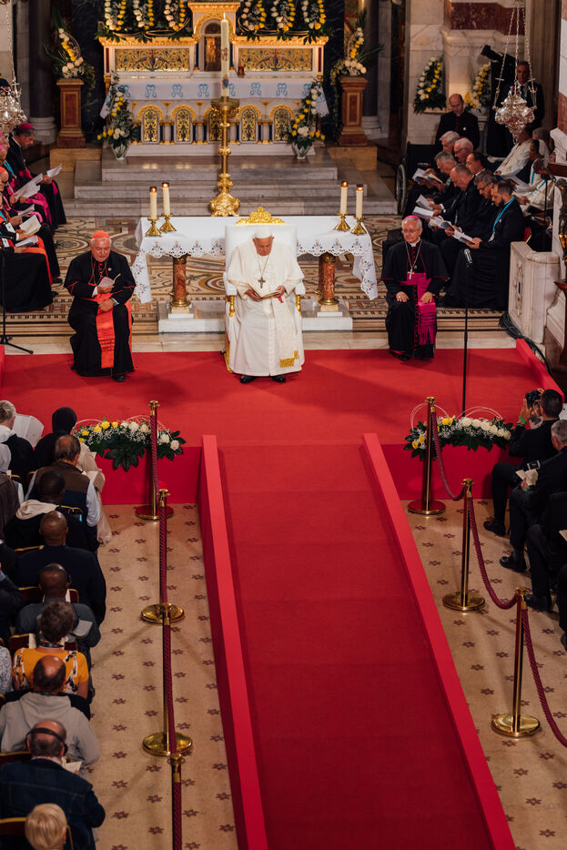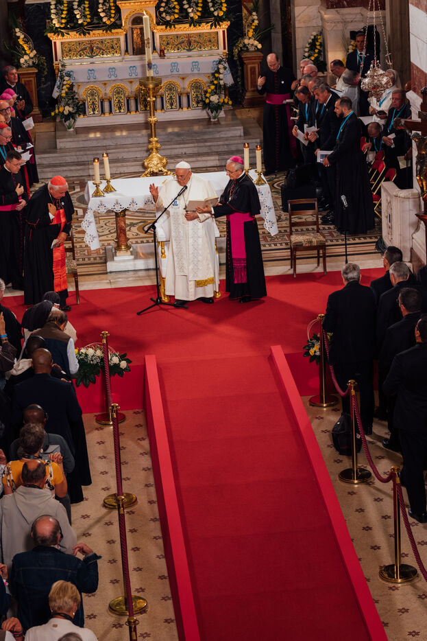 2023/09/22, Notre Dame de la Garde, Marseille. Pope Francis visits the Basilica of Notre Dame de la Garde (the Good Mother) at the invitation of Cardinal Jean-Marc Aveline as part of the Rencontres Méditerranéennes 2023.