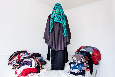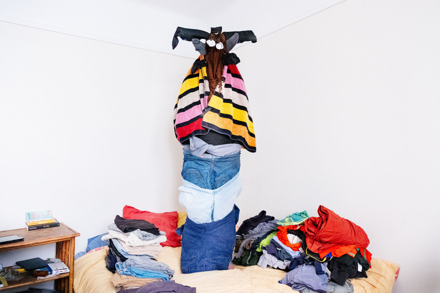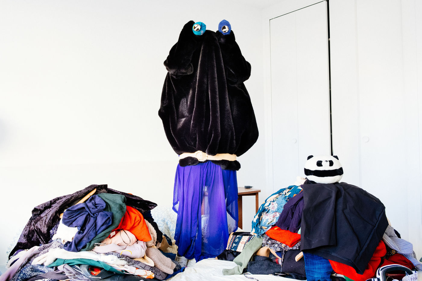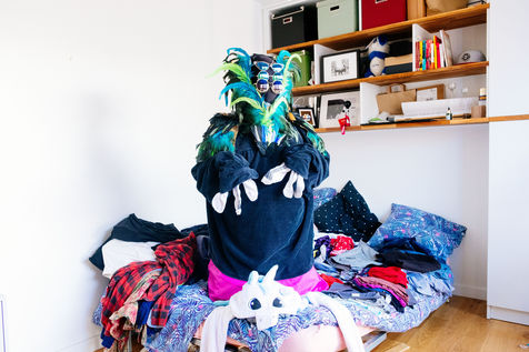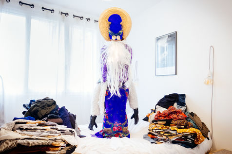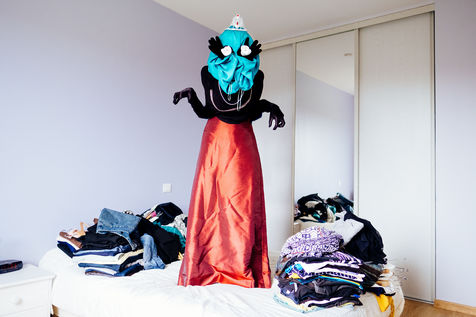 Fashion Monsters is a project that aims to question us all on our (over?)consumption of clothes. For each image, the process is simple: I go to the home of the person whose portrait I am making, we unpack all their clothes from their wardrobe, choosing some, and putting the rest on the bed. Then the subject is placed in the centre of the frame, and I transform him into a "monster" of clothes, with his active participation, covering him with successive layers of clothes, diverting their original purpose to make worrying eyes, a beastly mouth, endless claws.