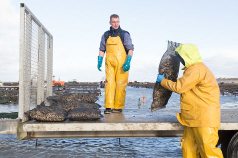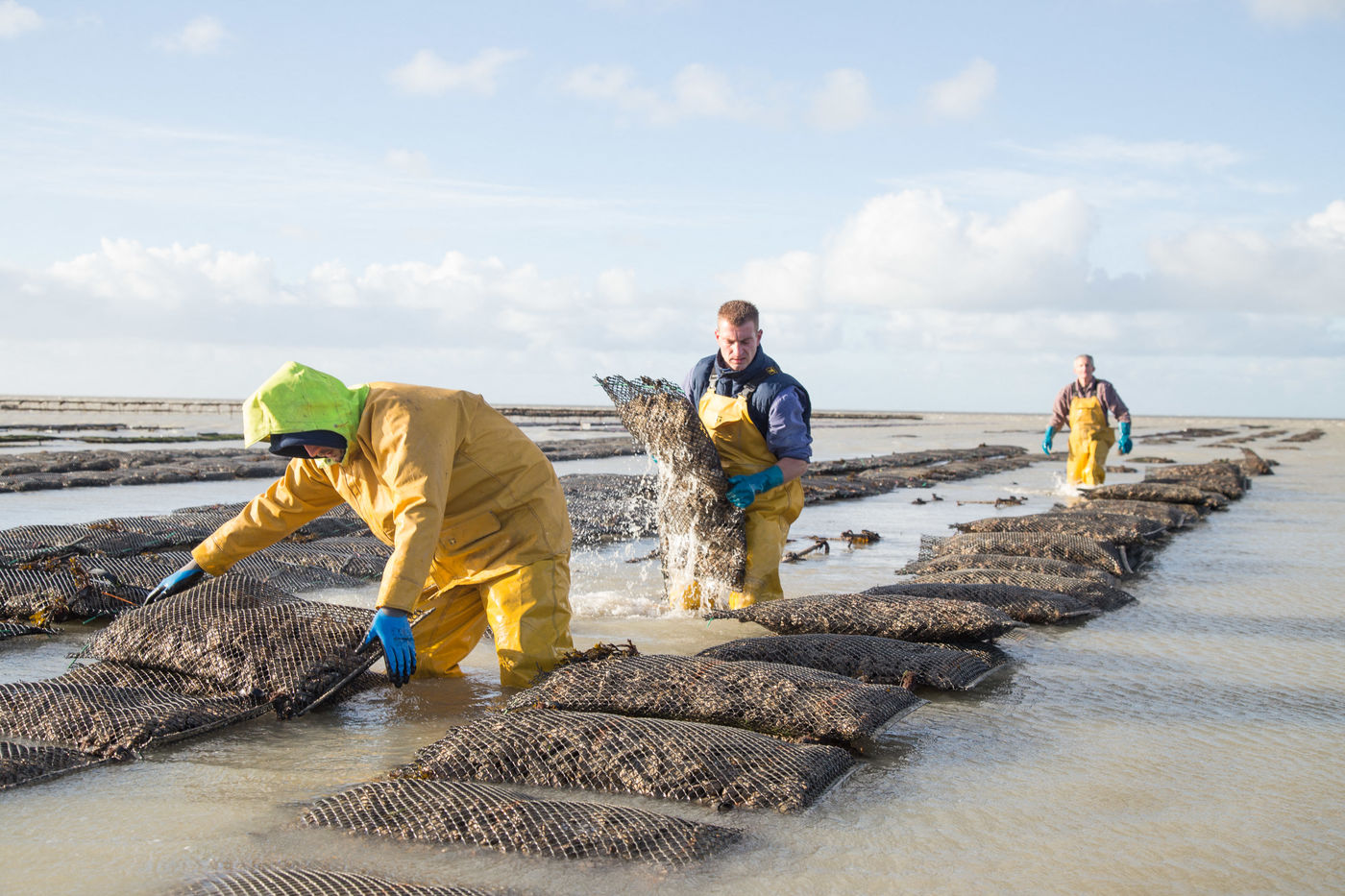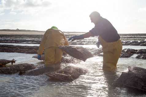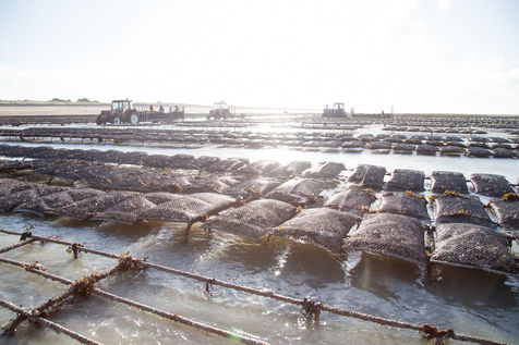 J'embarque alors sur la remorque du tracteur avec 3 employés et quelques minutes plus tard, nous nous retrouvons sur la plage, les cuissardes dans l'eau. Le soleil était présent, ce n'est pas comme la veille où les gars ont dû se rendre à la marée au même moment qu'une averse de grêle. Le vent reste frais, ils décrochent les poches, les mettent sur la remorque et rentrent à l'atelier de production.