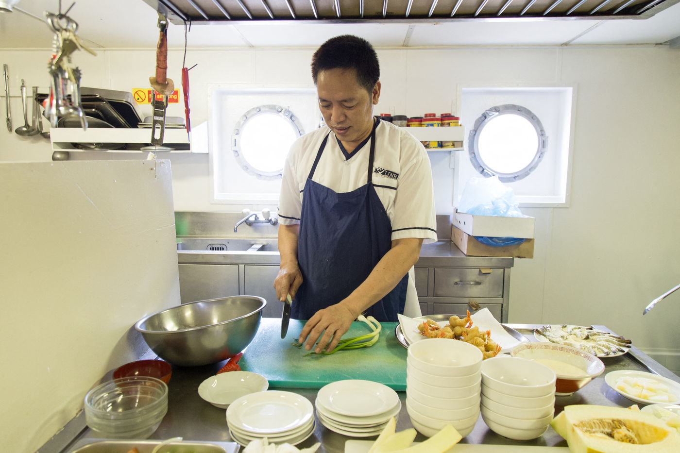 L'escale, (de 10 heures) est trop courte pour quitter le navire mais la connexion haut-débit disponible sur les bateaux aux abords des côtes permet aux marins de se reconnecter avec leurs familles.