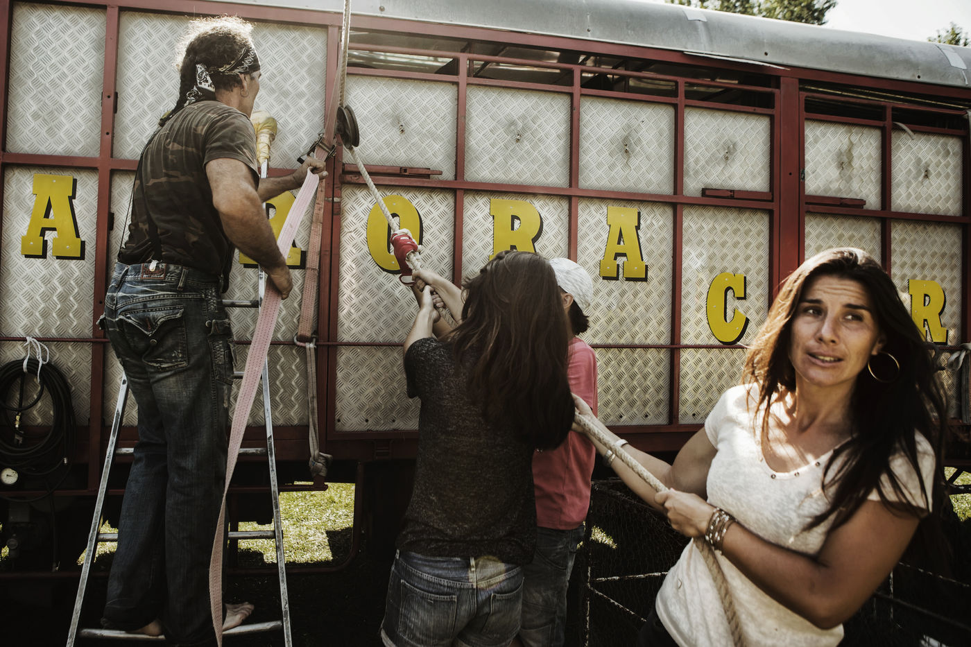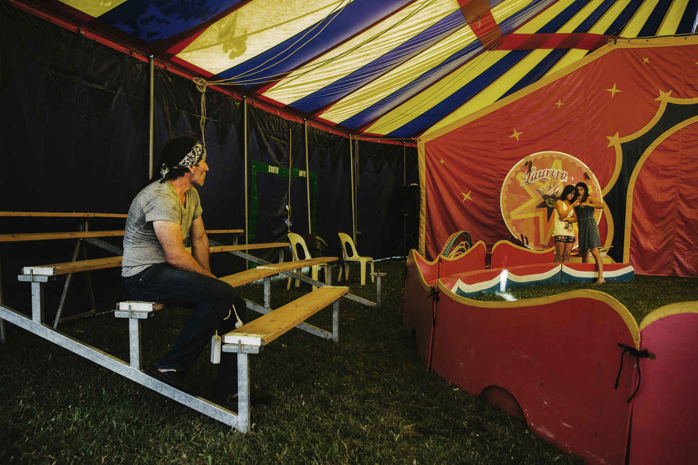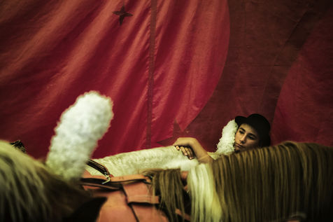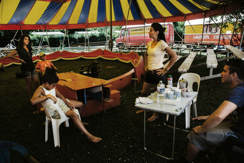 The Lauroras were leading an ordinary "gadjos" life in Paris when Jean-Marc, a leading stuntman at Disneyland, suggested to his wife that they start their own circus company with a pocket tent and three trailers chased on the corner. While the couple alternate equestrian acrobatics and burlesque performances, Aleandro, 8, appears from time to time on the track to play the clown while his younger sister Enola improves her hula-hoop behind the scenes. "Giovan and Nina joined us a little later. Nina was still in her crib when we started the circus," Nadège recalls.