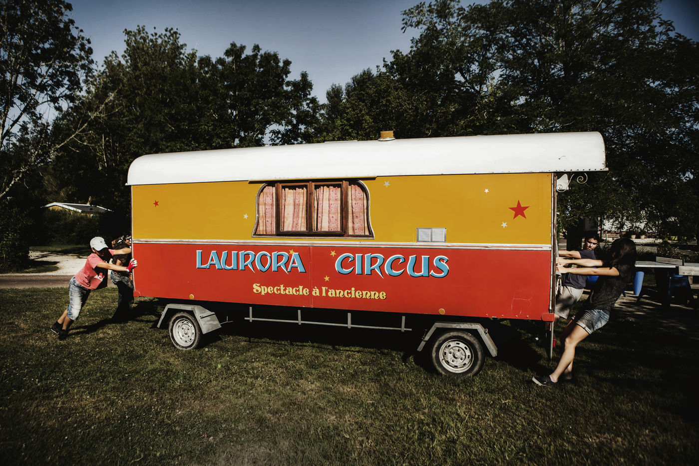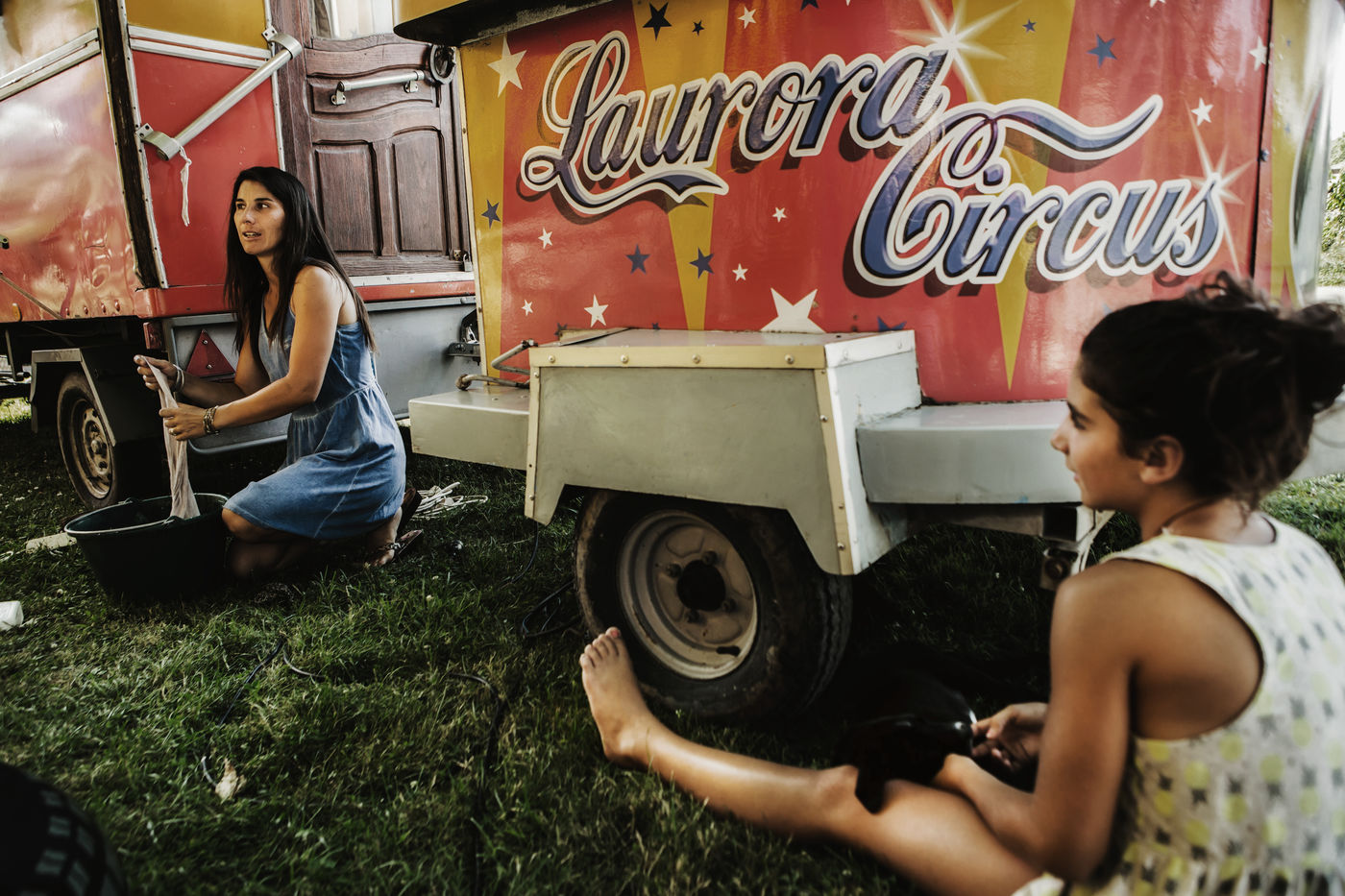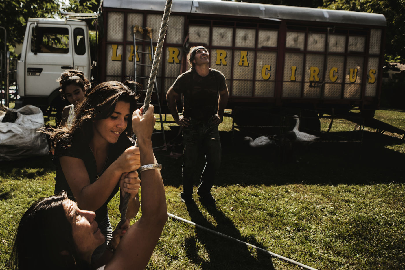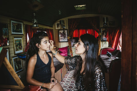 Les Laurora menaient une vie ordinaire de « gadjos » à Paris quand Jean-Marc, cascadeur de premier plan à Disneyland, a suggéré à sa femme de monter leur propre compagnie de cirque avec un chapiteau de poche et trois roulottes chinées sur leboncoin. Tandis que le couple alterne numéros de voltige équestre et performances burlesques, Aleandro, 8 ans, apparaît de temps à autre sur la piste pour faire le clown tandis que sa jeune soeur Enola se perfectionne au hula-hoop en coulisses. « Giovan et Nina nous ont rejoints un peu plus tard. Nina était encore dans son berceau quand on a lancé le cirque », se souvient Nadège.