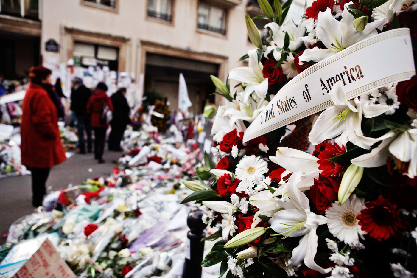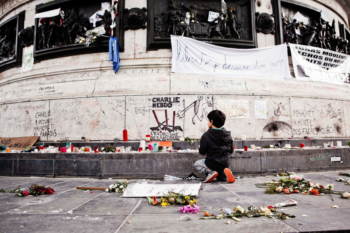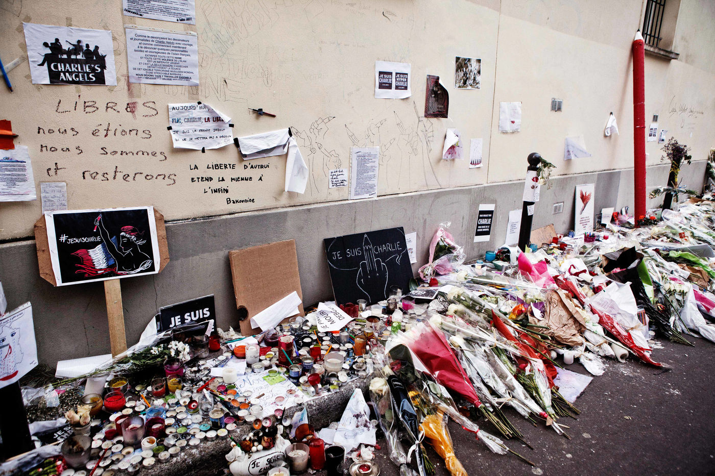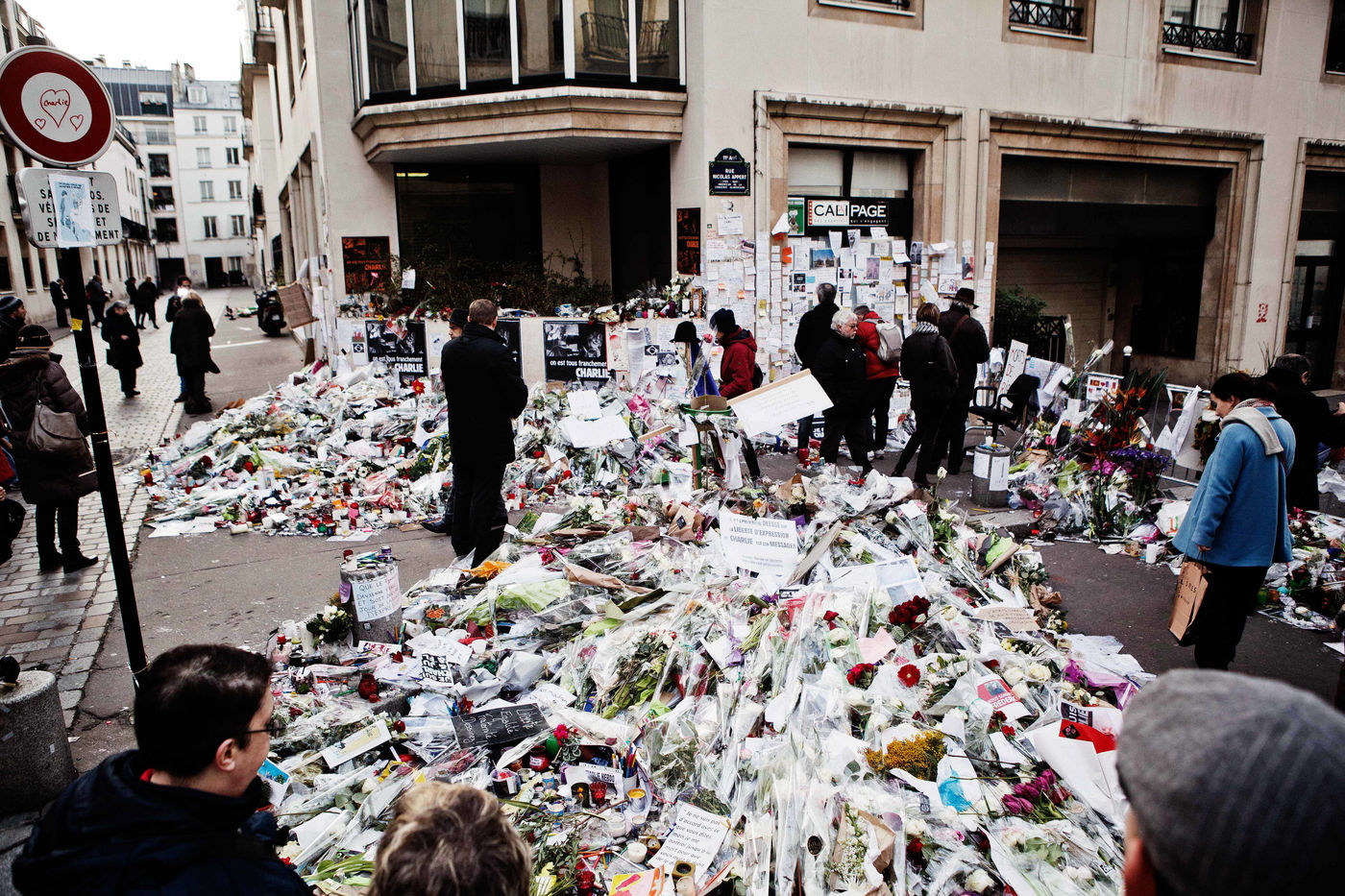 Hommage aux morts de Charlie Hebdo que ce soit dans les rues a proximite de la rue Nicolas Appert, siege de la redaction ou a eu lieu l attentat ainsi que place de la Republique.