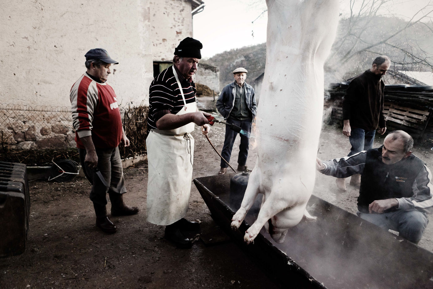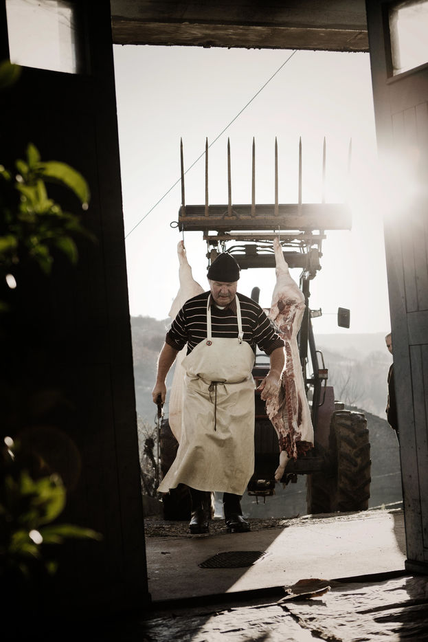 Leo raises 2 pigs all year round and every 2 years, he brings the killer and the whole family to kill the pig and make sausages, sausages, scraps, all this in a good mood!