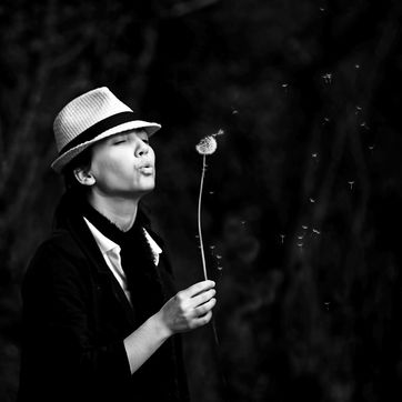 Le souffle de l'espoir. Jeune femme soufflant sur un pissenlit.