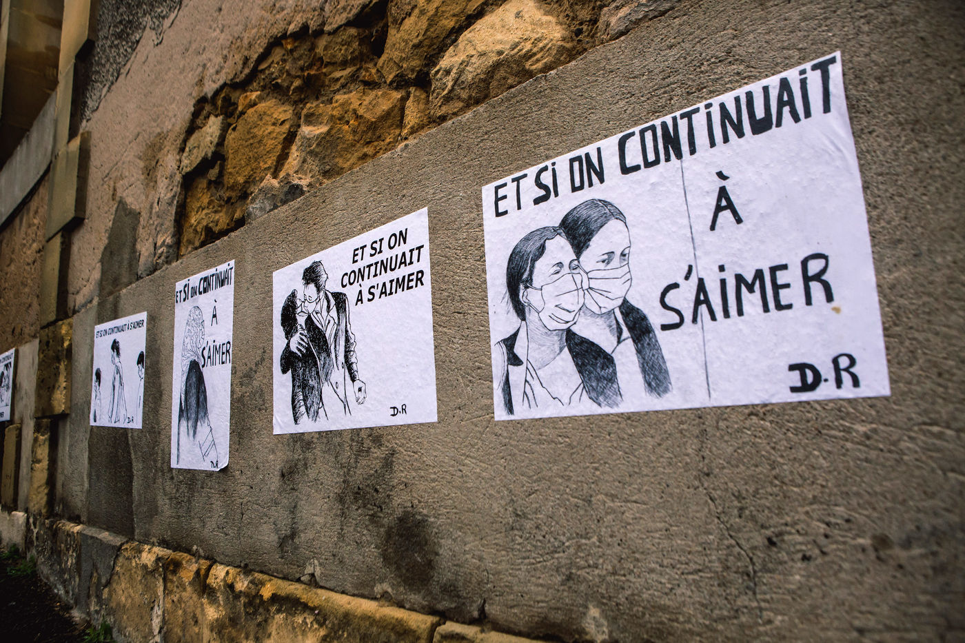 The artist from Street Art D.R. stuck posters on the theme "Et si on continuait a s aimer" on the walls of the town of Bergerac.