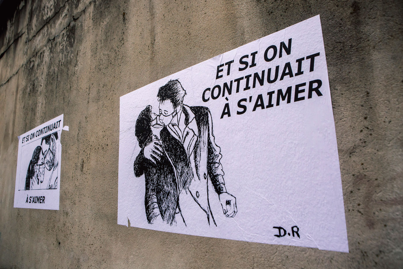 L'artiste de Street Art D.R a coller des affiches sur le theme Et si on continuait a s aimer sur les murs de la ville de Bergerac.