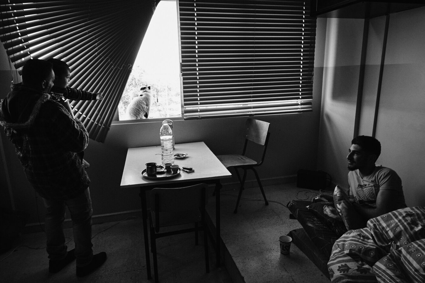 Il faut passer devant les restes d'un blindé datant des guerres précédentes pour accéder à l'école technique de Tyr. Un des employés des lieux m'entraîne dans les salles de classe des étages supérieurs. Celles-ci servent de logements pour les nombreuses familles ayant fui leurs villages du sud-Liban après les bombardements de l'État d'Israël. Certaines familles sont arrivées depuis plus de quatre mois maintenant. La vie y est plus supportable bien que toujours extrêmement précaire grâce aux dons de nombreux citoyens du pays et à l'aide internationale. La vie des résidents de l'école est rythmée par de nombreuses coupures de courant. Ici on retrouve un réchaud à gaz pour cuisiner avec les voisins, tandis que dans la pièce adjacente, plusieurs chichas trônent devant le grand tableau noir de la salle de classe. Les exilés essaient malgré la situation de garder un semblant de vie sociale, pendant que les enfants font la course en trottinette dans les longs couloirs de l?école. leur rire rythmant le quotidien des habitants. Dans l?école publique voisine, la Tyre second school, la municipalité n?assure plus l?alimentation nécessaire en électricité et le bâtiment est plongé dans le noir toute la journée. C?est en se servant de la lampe torche du téléphone portable d?une de ses collègues que la directrice de l'établissement assure l'administration de son école et les nombreux cours dispensés aux enfants réfugiés. L?école propose toujours la scolarisation pour les enfants des familles ayant fui le sud afin d?éviter un décrochage scolaire et une aggravation de leur situation. Un homme usé est également arrivé il y a 4 mois après que sa maison ait été bombardée à quelques kilomètres de la frontière. Comme sa voisine de chambre, très âgé et gravement malade, il ne se fait aucune illusion quant à un éventuel retour chez lui. Les capacités pour obtenir des médicaments sont limitées et beaucoup ont peur de finir leurs jours ici. Le déclassement soudain de ces nombreux frontaliers qui ont tout perdu en l?espace de quelques heures exacerbe les tensions avec un Etat libanais incapable de gérer la crise et l?ombre planante d?une guerre qui ne dit pas encore son nom ne fait rien pour arranger la situation.