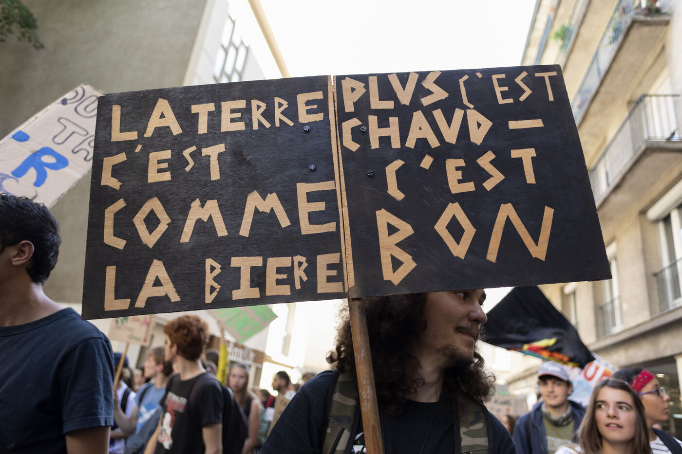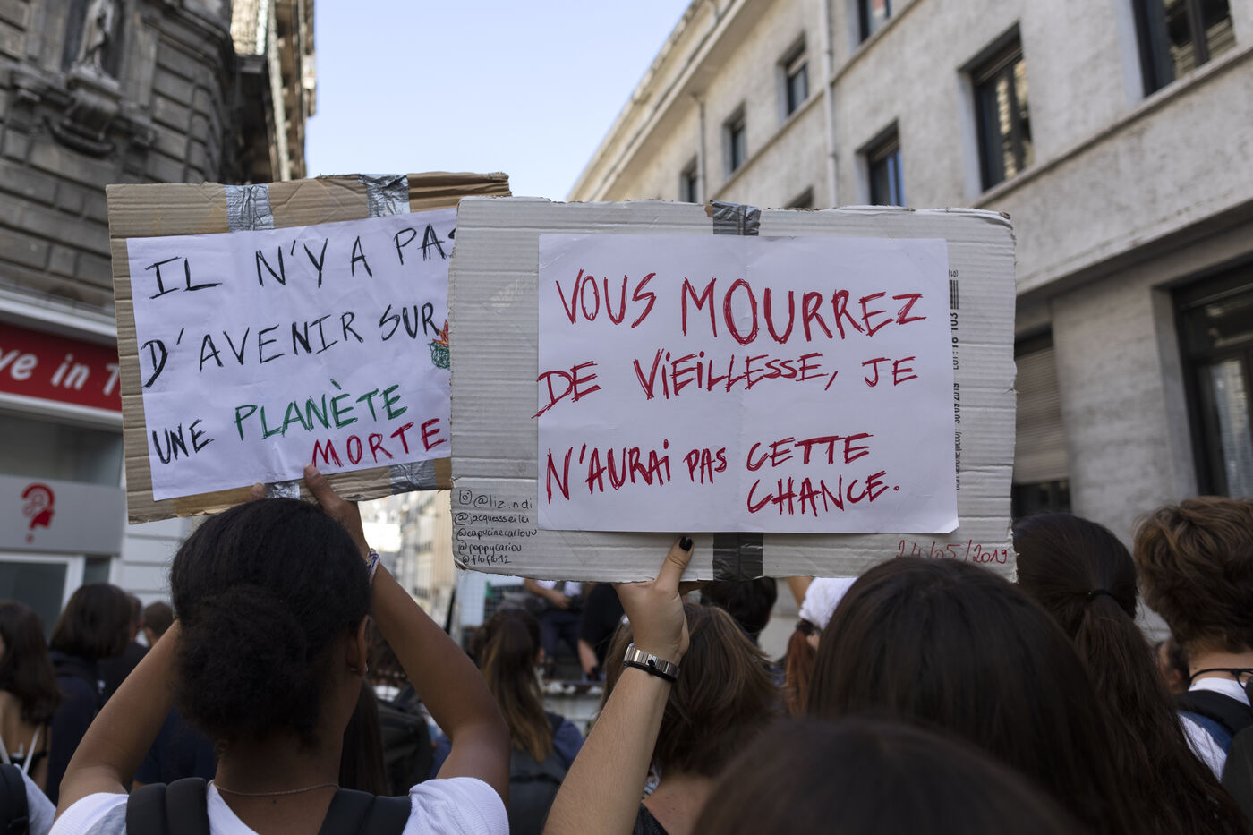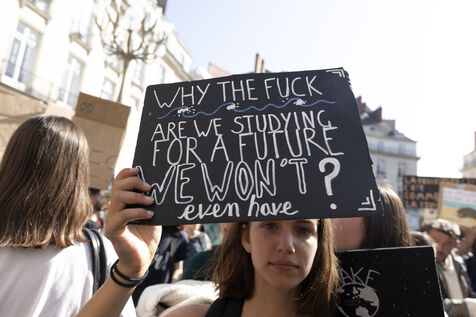 Global strike for climate, youth hold placards and banners against climate change during a global protest in Nantes on September 20, 2019.