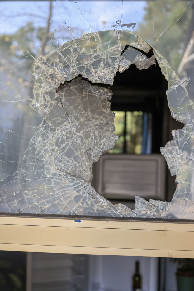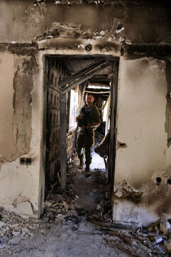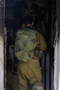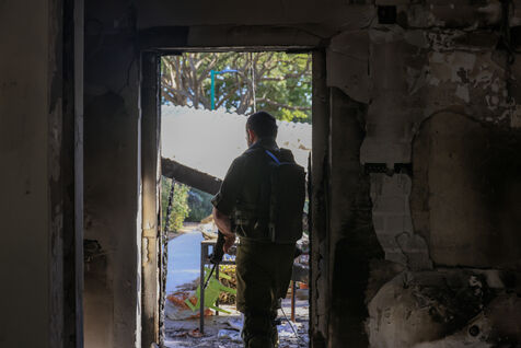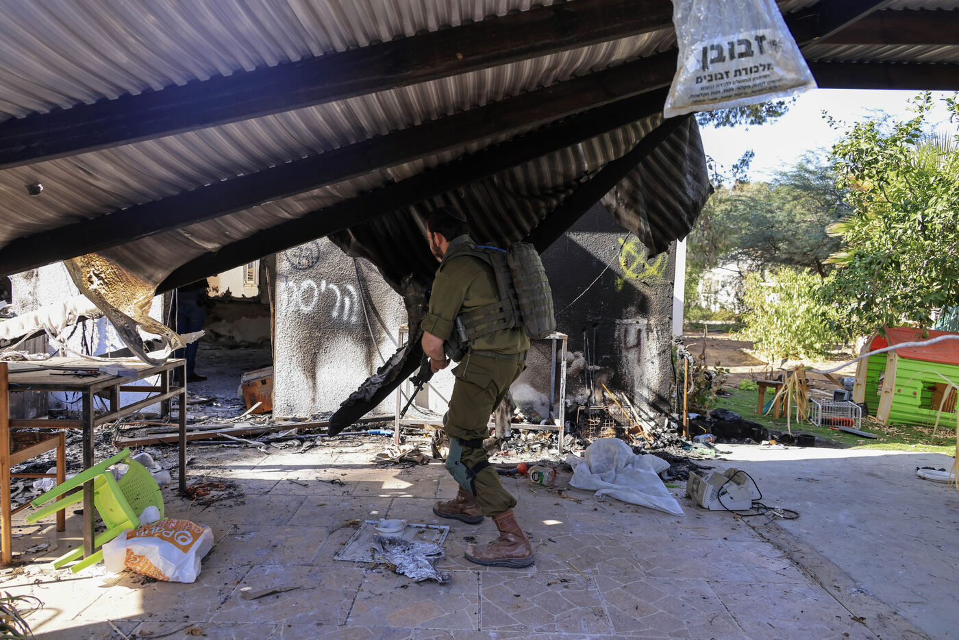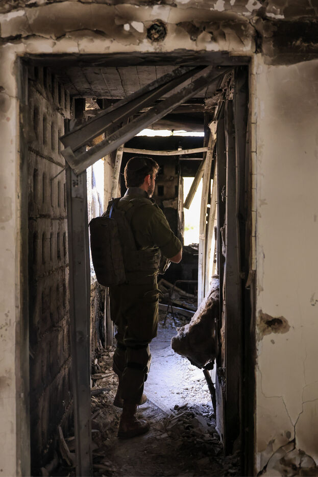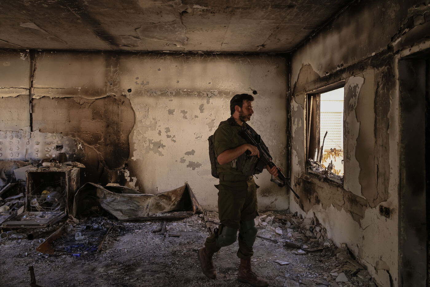 Un soldat dans une maison endommagee dans le kibboutz Nir Oz, pres de la bande de Gaza, attaque le 7 octobre par des militant du Hamas, le 30 octobre 2023.