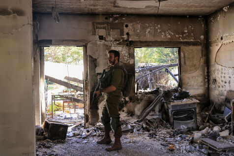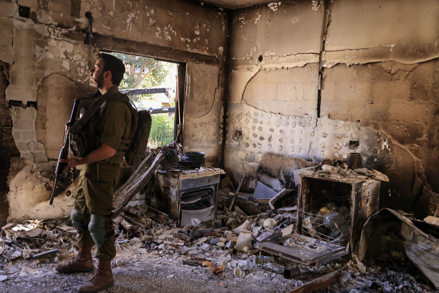 A soldier is seen inside a damaged house in the kibbutz Nir Oz, near the Gaza Strip, attacked on October 7 by the Palestinian militant group Hamas, on October 30, 2023.