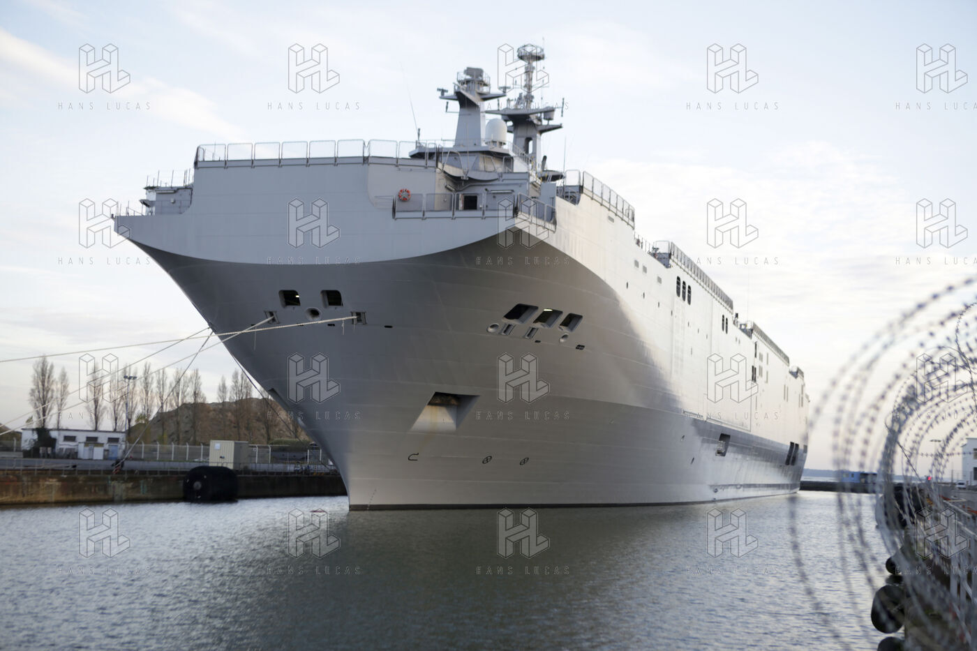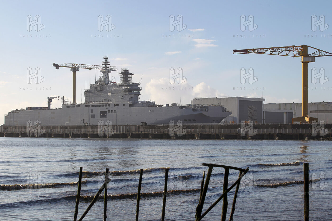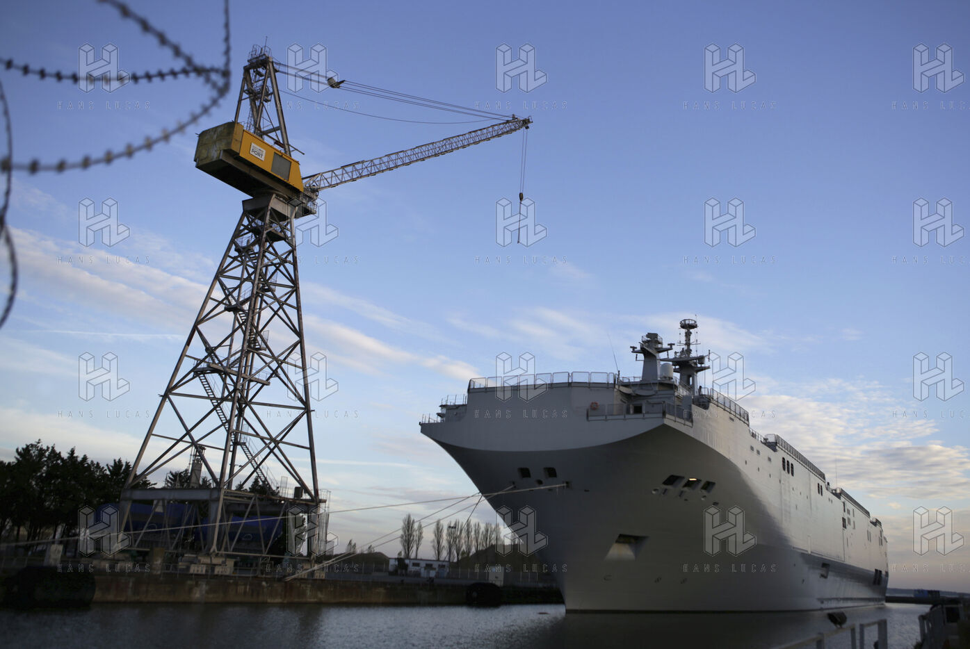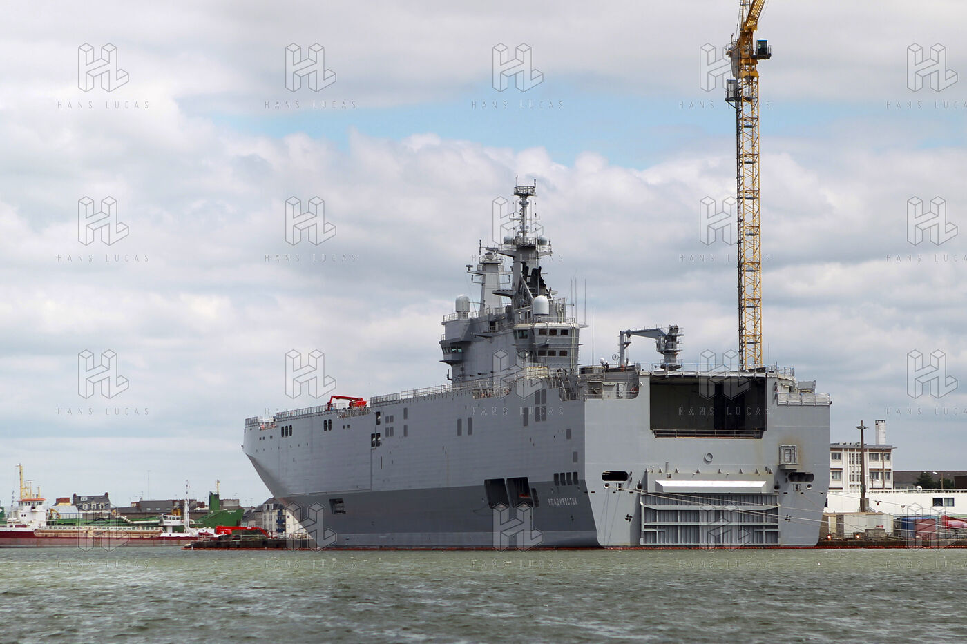 Le navire de guerre Vladivostok, porte-helicopteres de classe Mistral commande par la Russie, est a quai dans les chantiers navals STX France a Saint-Nazaire.