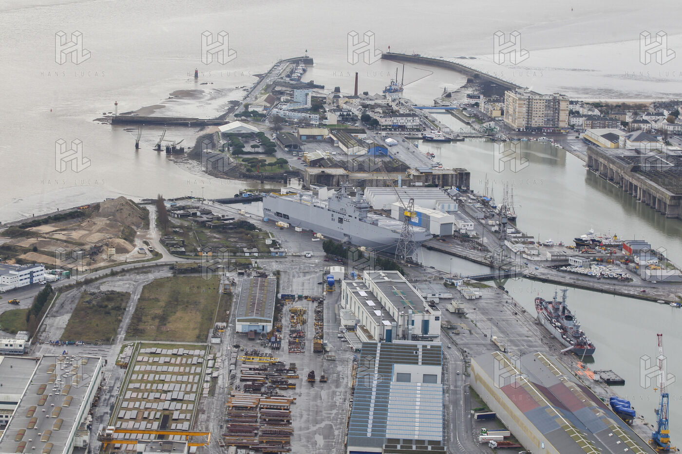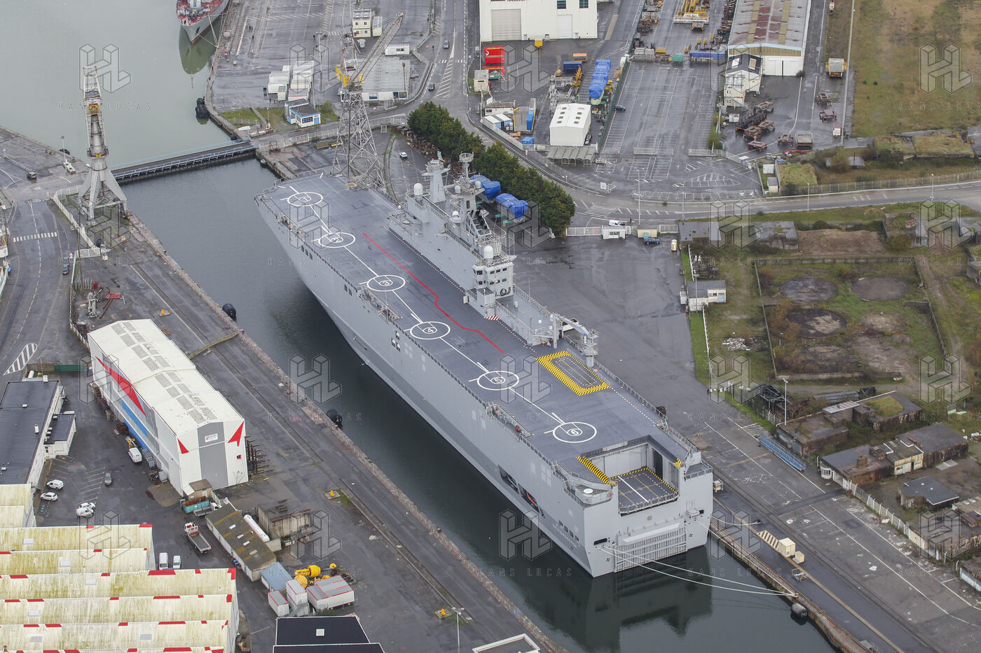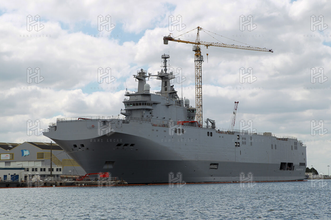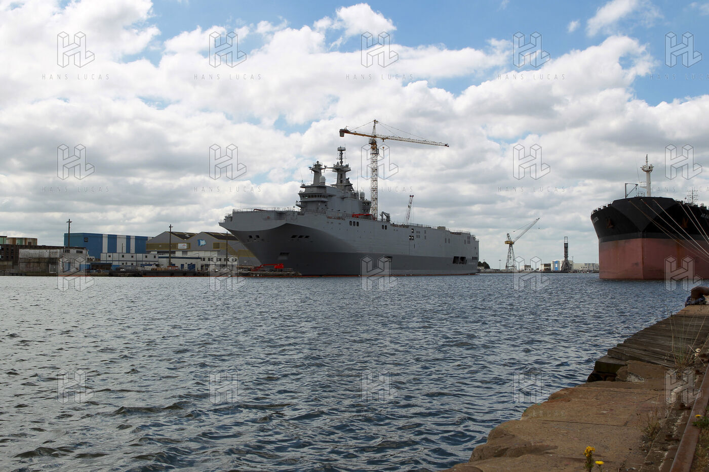 Le navire de guerre Vladivostok, porte-helicopteres de classe Mistral commande par la Russie, est a quai dans les chantiers navals STX France a Saint-Nazaire.