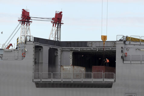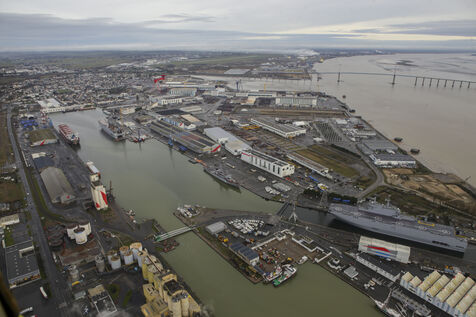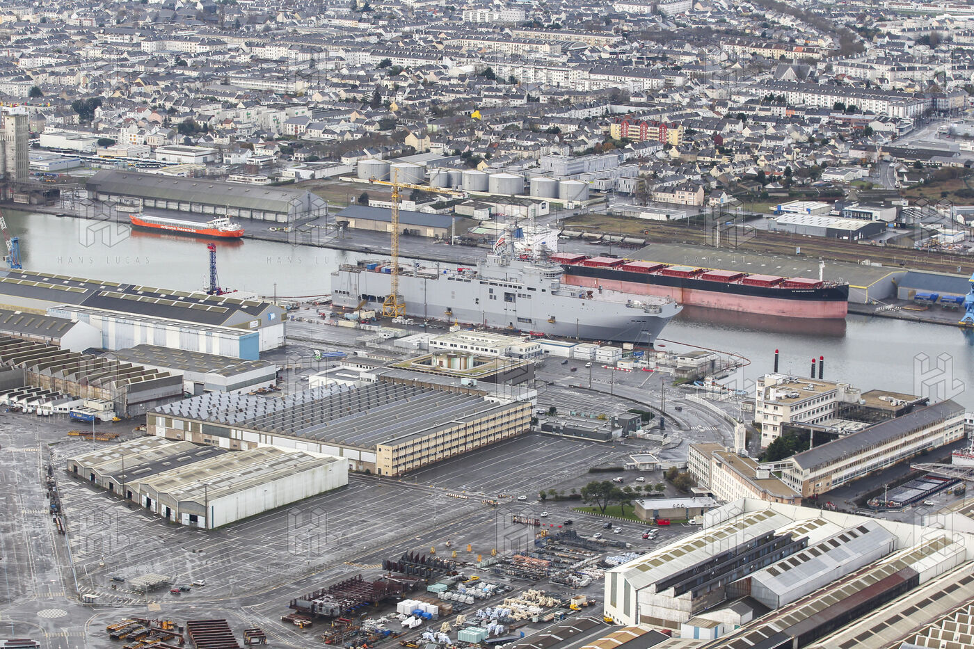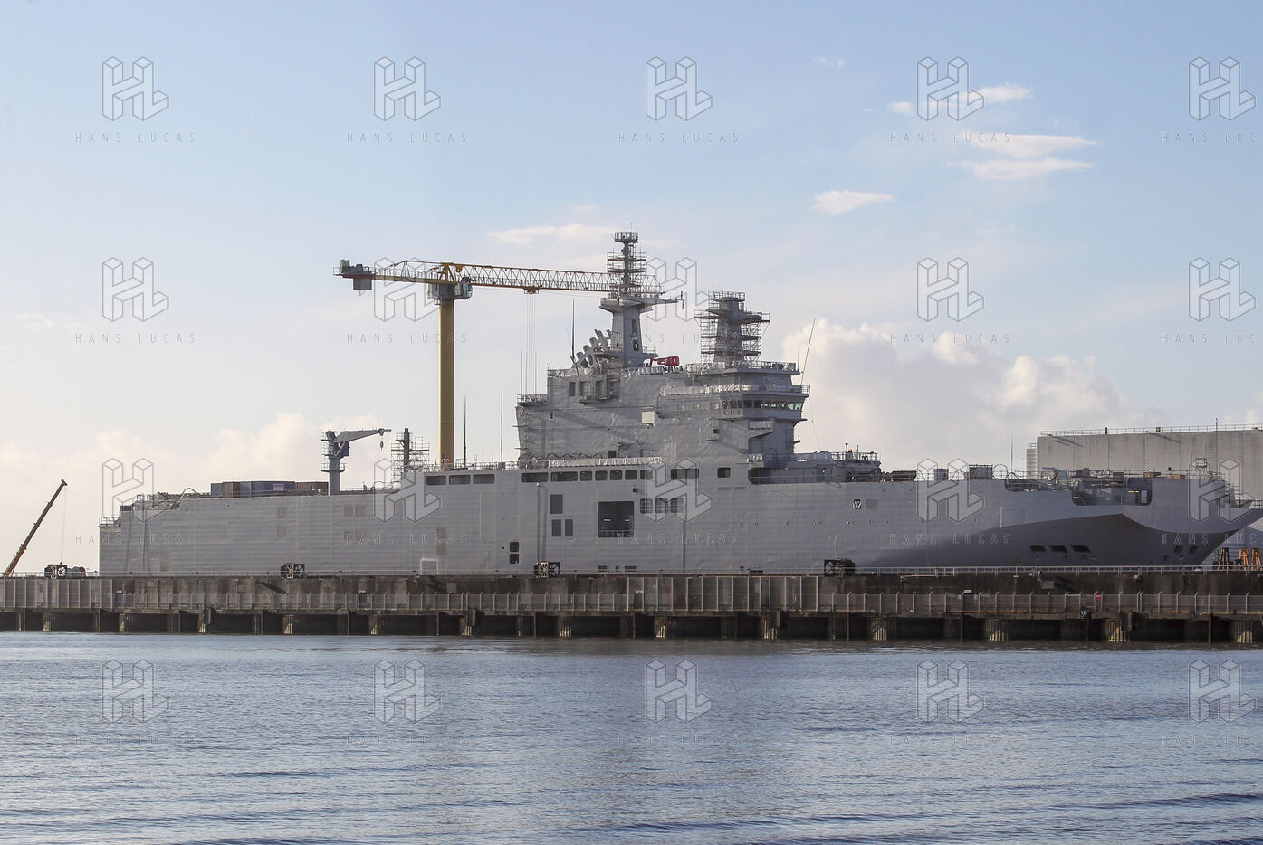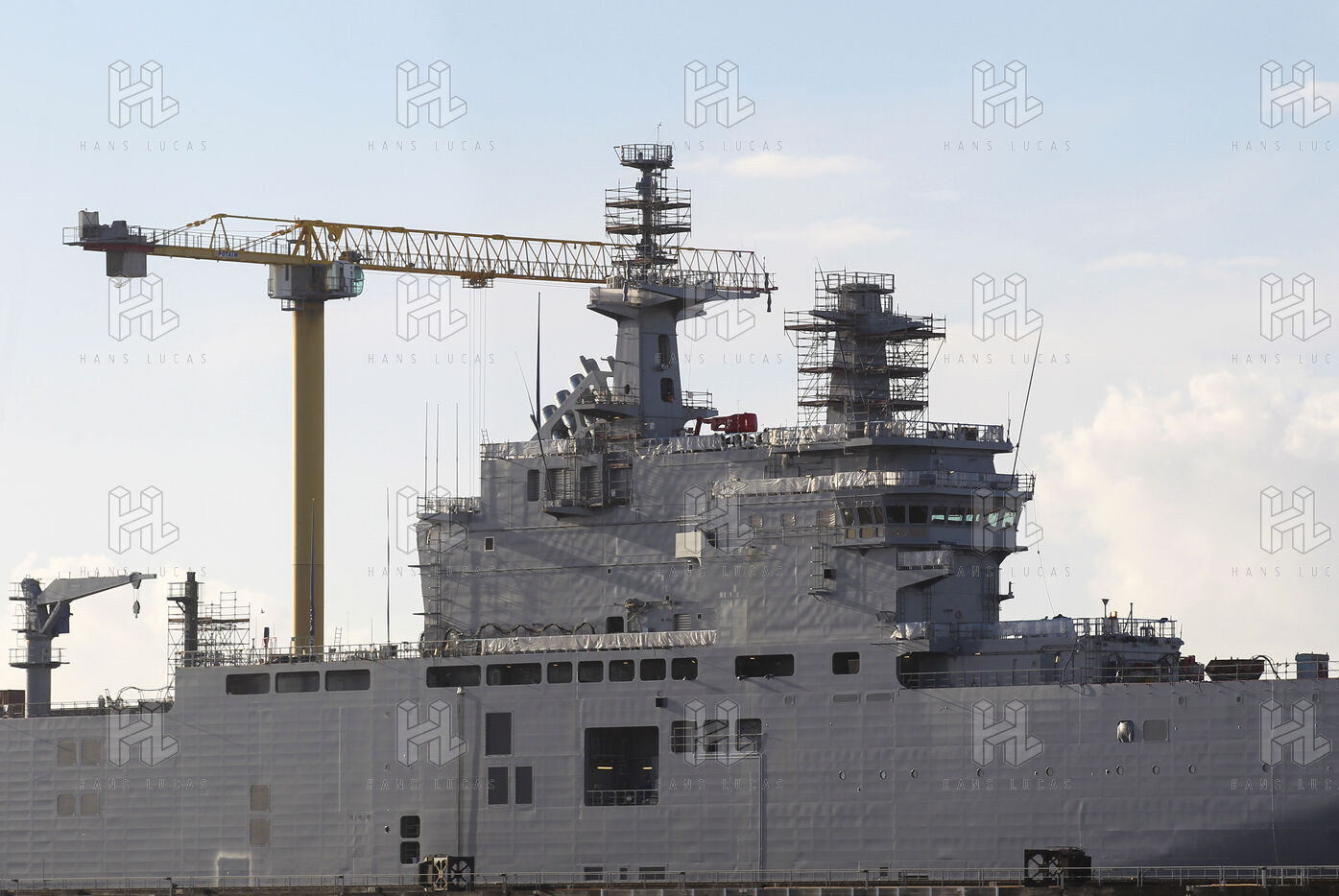 Le navire de guerre Vladivostok, porte-helicopteres de classe Mistral commande par la Russie, est a quai dans les chantiers navals STX France a Saint-Nazaire.