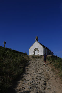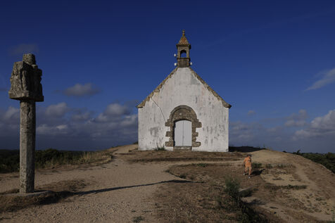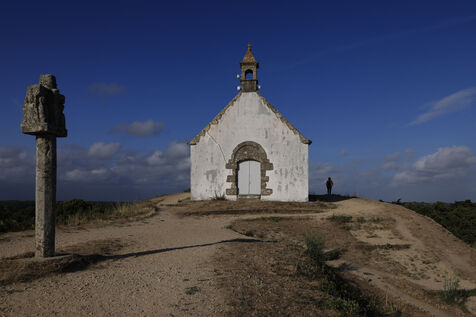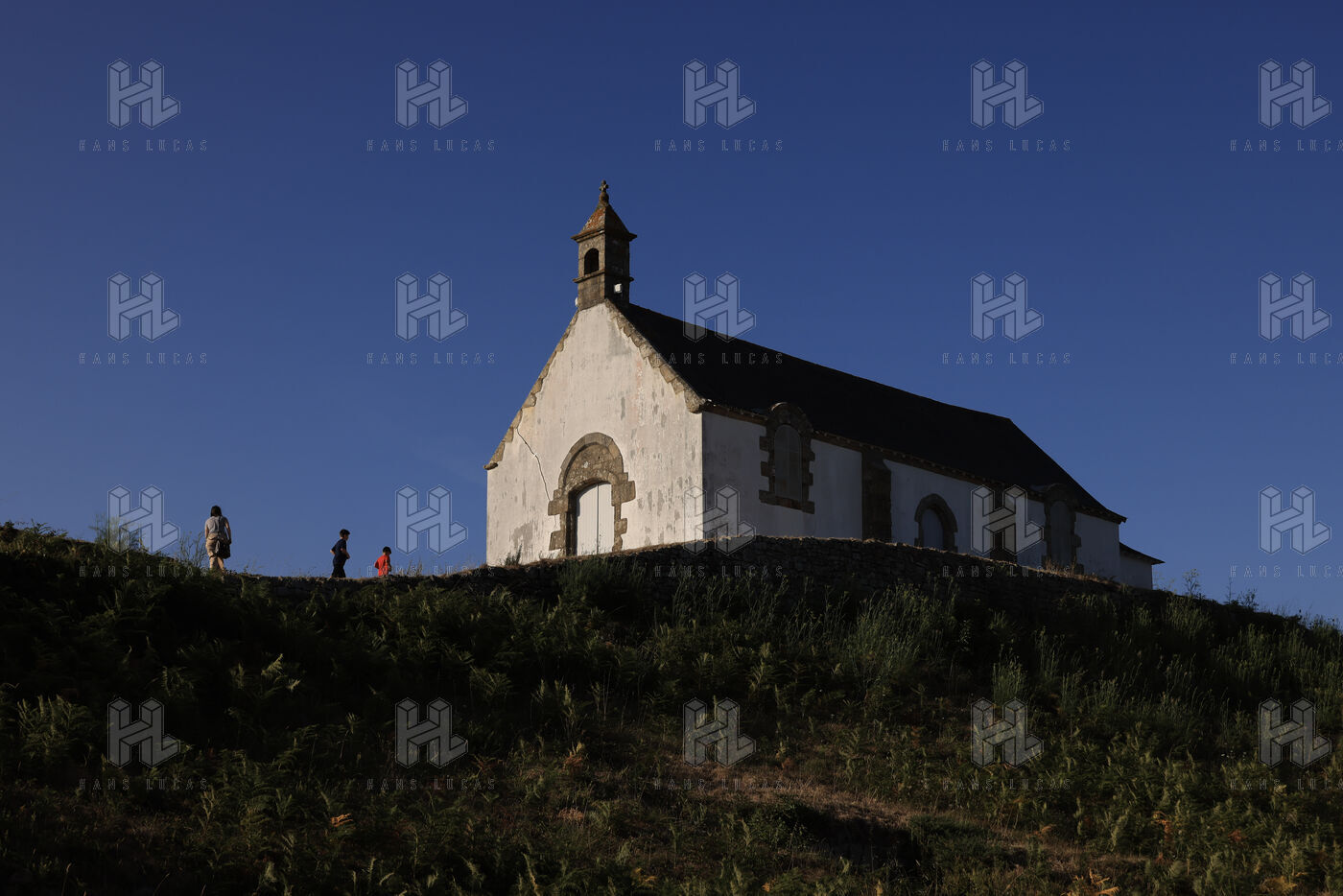 Tourists visit the chapel at the top of the Saint Michel tumulus, a classified historic monument. Carnac, western France, on July 15, 2025.