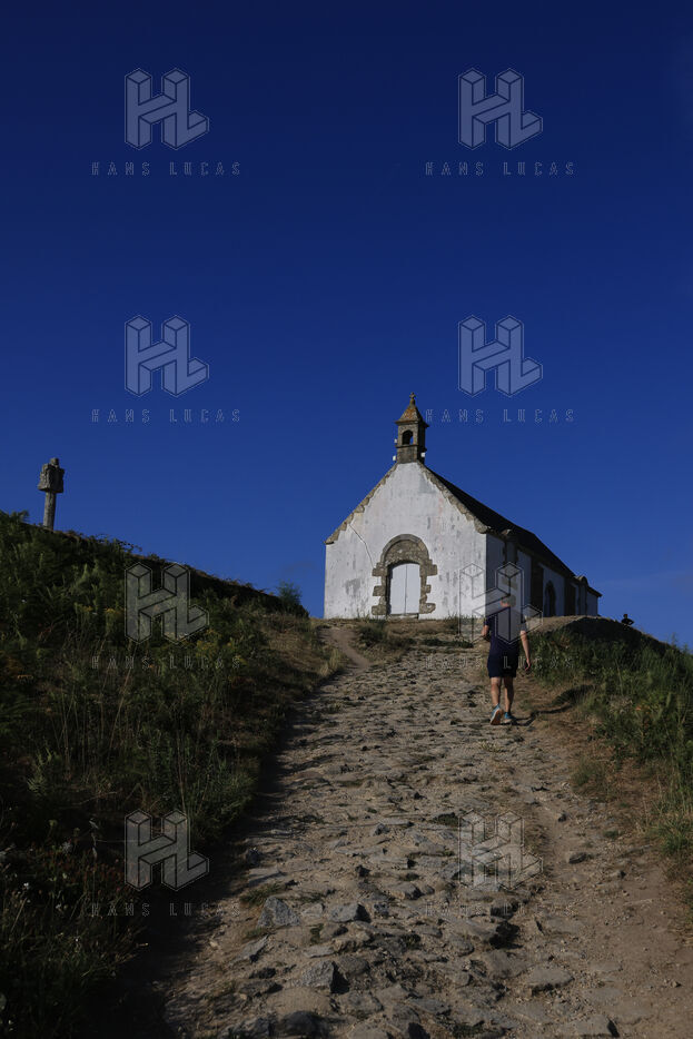 Des touristes visite le site de la chapelle au sommet du tumulus Saint Michel, site classe monument historique. Carnac le 15 juillet 2025.