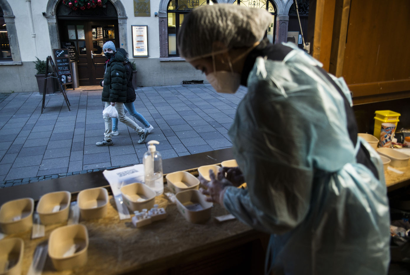A woman health worker works alone in a COVID 19 doing antigenic testing in a stand in front of a pharmacy in Strasbourg. These tests are faster than PCR tests. A fifth wave of the global pandemic is ongoing in France with tens of thousands of positive cases of COVID registered each day. New restrictions have been anounced, amidst the Omicron variant's propoagation and before winter holidays.