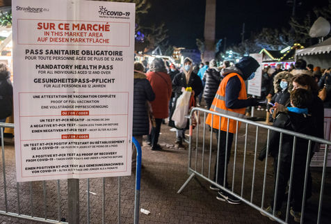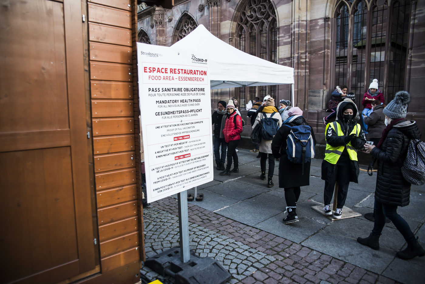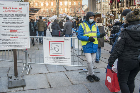 En pleine cinquième vague de la pandémie de COVID 19, à Strasbourg et depuis mardi 7 decembre, l'accès à une troisième place du marché de Noël, la place du Chateau, est conditionné à la présentation du pass sanitaire. Des panneaux indicatifs rappellent les règles en vigueur selon les espaces. Le port du masque est obligatoire sur la Grande Île et des zones de restauration ont été installées sur les marchés de Noël. Le premier ministre Jean Castex sera en visite ce vendredi 10 decembre. Prises de vues les 6 et 7 décembre 2021.