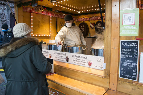 Amidst a 5th COVID 19 pandemic wave, in Strasbourg and since tuesday 7th of December, acces to a third Christmas market, on the place du Chateau, is limited to health pass presentation. Signs indicating the new mesures have been put in place. Mask wearing is mandatory in the city center and eating zones have been put in place Prime Minister Jean Castex is announced to visit on friday 10th of December. Views taken on 6th and 7th of December 2021.