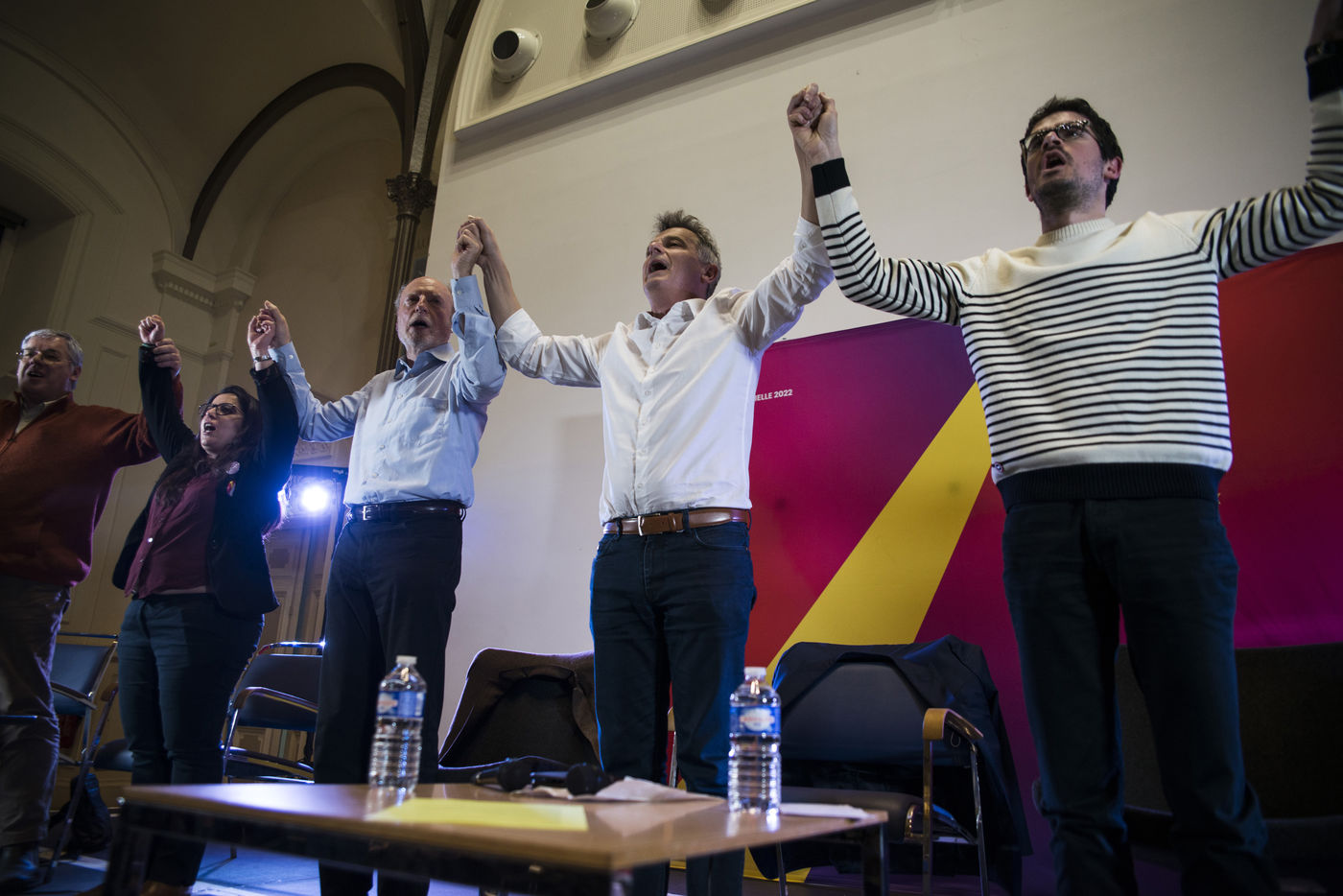 Le candidat du Parti Communiste Francais (PCF) à l'élection présidentielle 2022, Fabien Roussel, tient un meeting a Strasbourg dans une salle du bâtiment de l'Aubette pres de la place Kléber devant plusieurs centaines de militants et curieux du Grand-Est.
