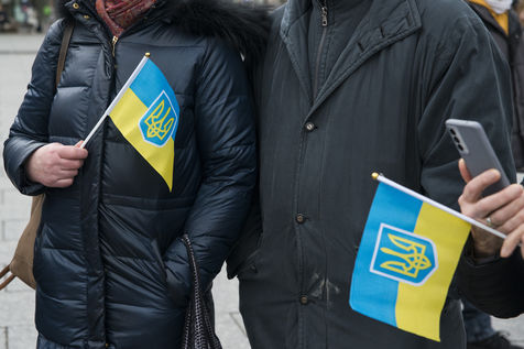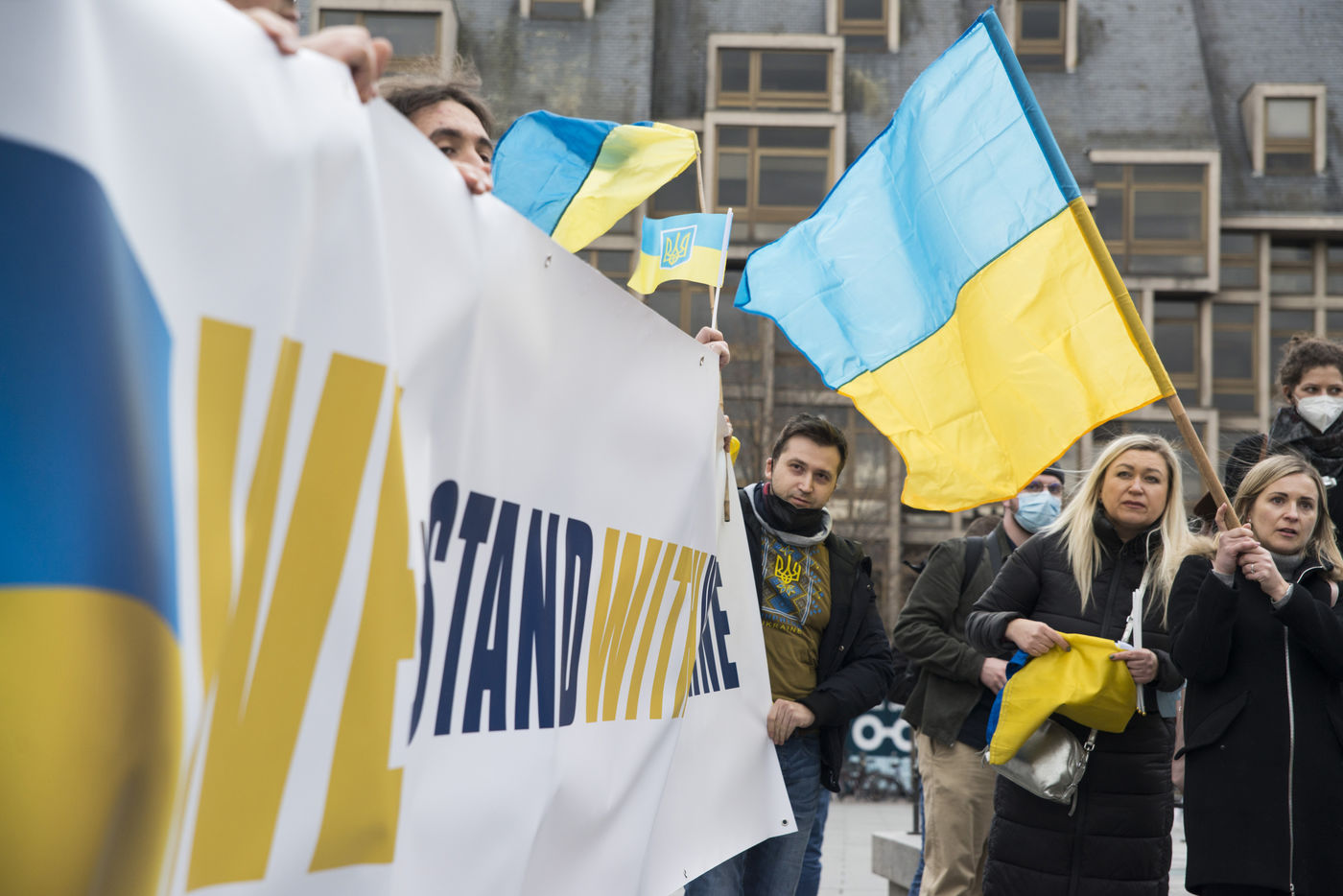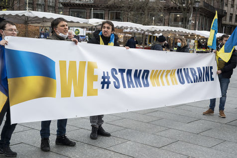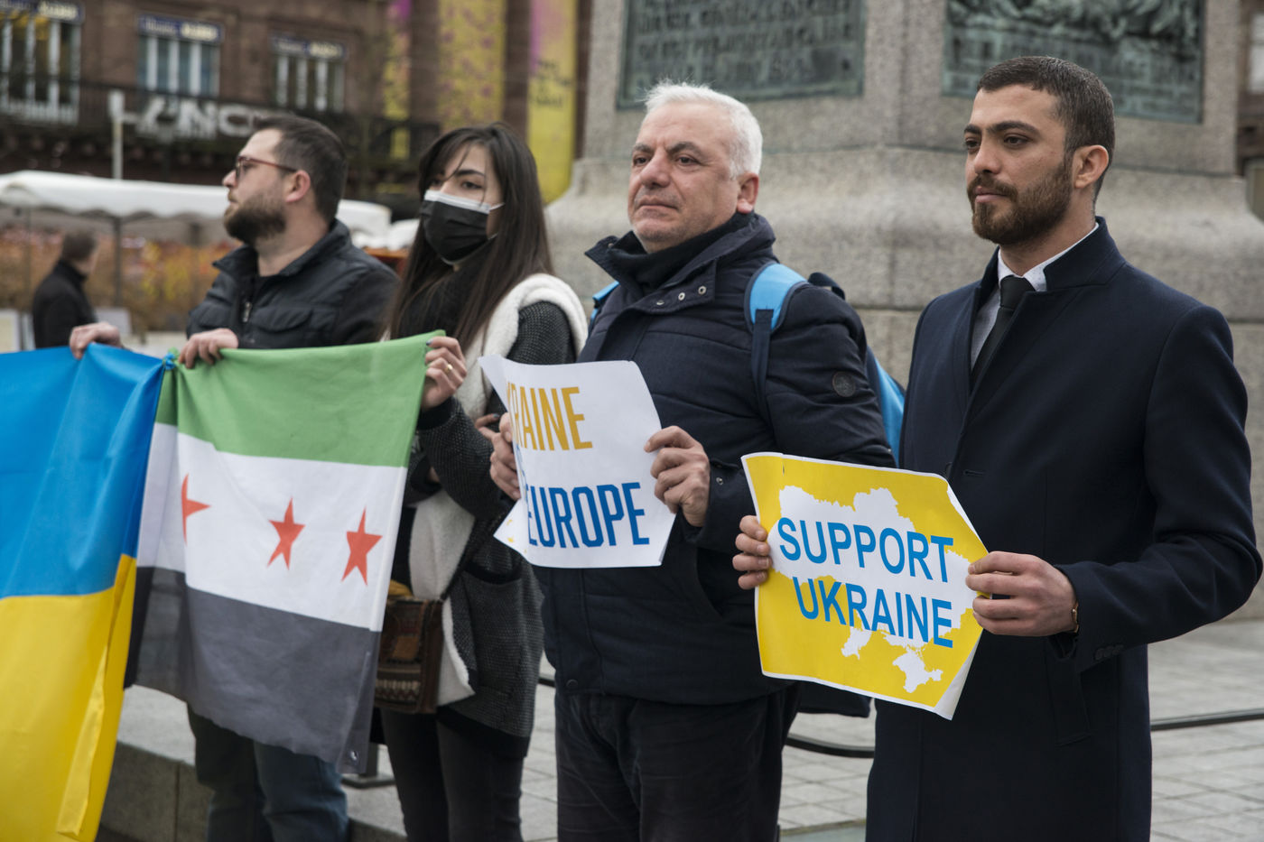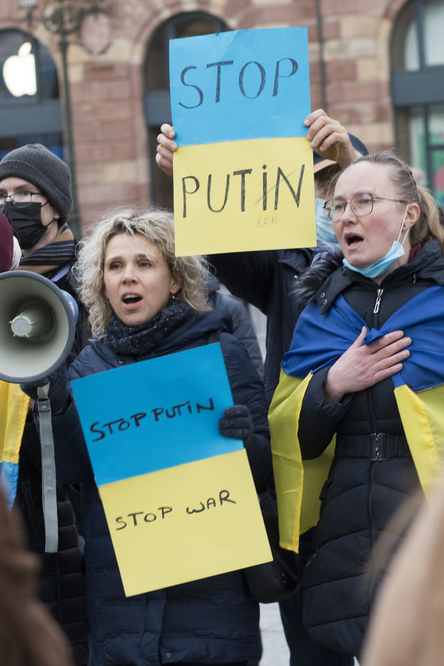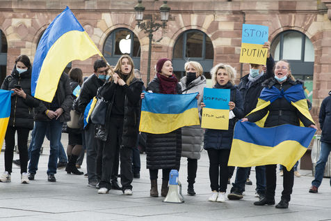 Ukraine community and sympathizers gather place Kleber in Strasbourg protesting against the Russian offensive that started on this thursday 24th of Febuary. A few other persons held signs in front of the russian consulate. Strasbourg's mayor Jeanne Barseghian (EELV) communicated her "full support to the ukrainian people" in a press release and town buildings (administrative center, city hall and the Beatus Rhenanus Bridge) will be illuminated at night with the colors of the ukranian flag.