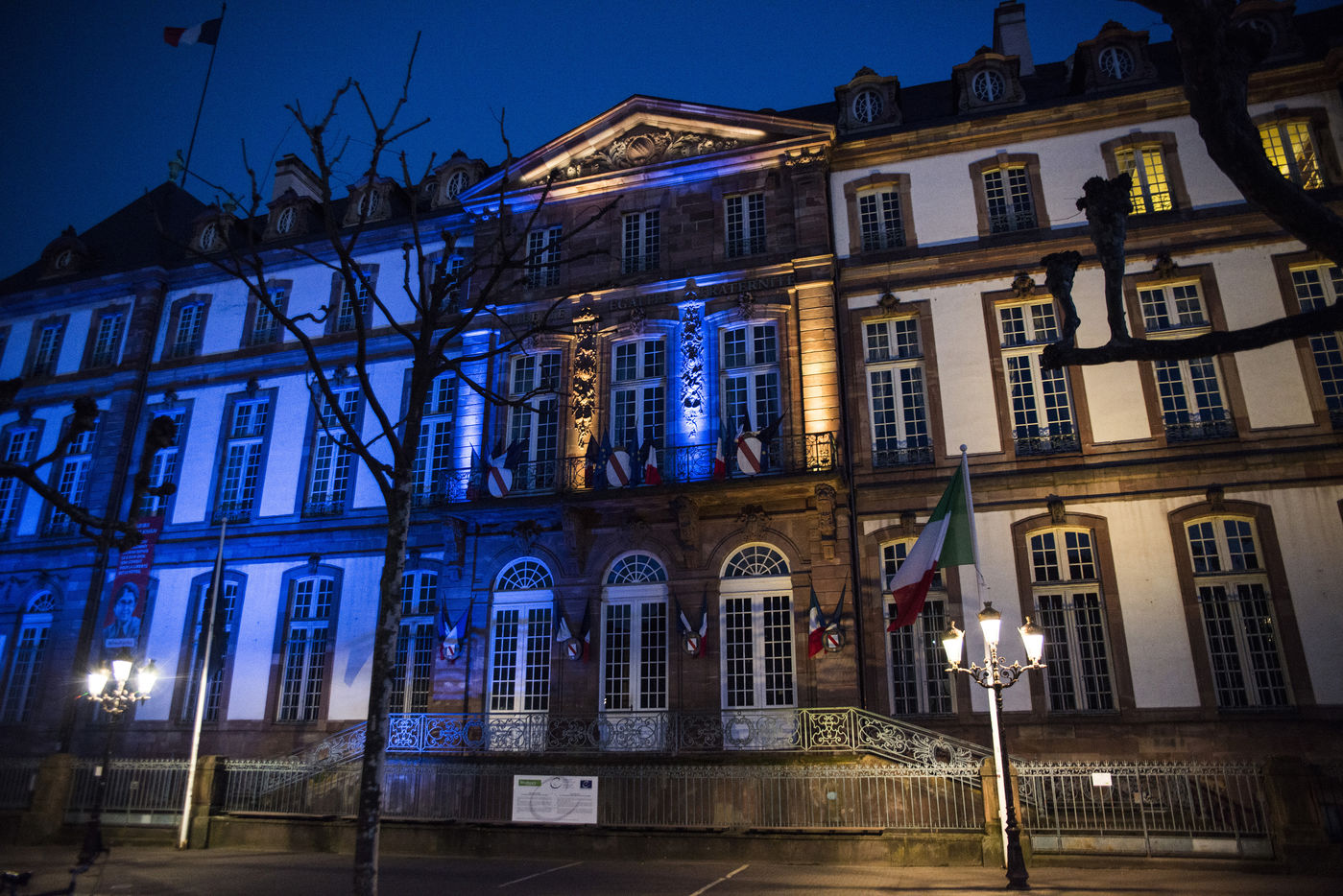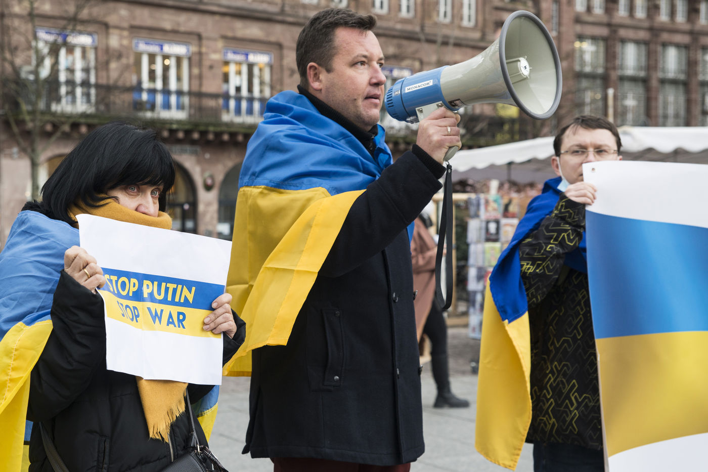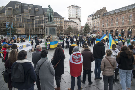La communaute ukrainienne de Strasbourg et des sympathisants se regroupent place Kléber pour manifester contre l'offensive russe debutée ce jeudi 24 fevrier 2022. Une poignée de personnes ont également tenu des pancartes devant le consulat de Russie. La Maire de Strasbourg Jeanne Barseghian (EELV) a affirmé son "soutien plein et entier au peuple ukrainien" dans un communiqué et la Ville de Strasbourg projettera les couleurs du drapeau ukrainien sur plusieurs bâtiments publics dont l?Hôtel de Ville, le centre administratif, et le Pont Beatus Rhenanus.